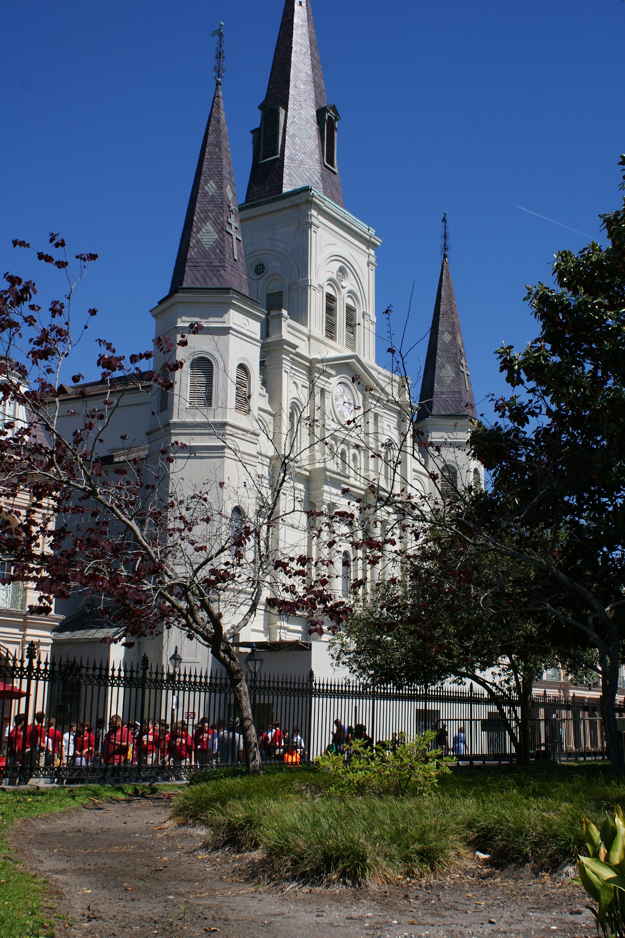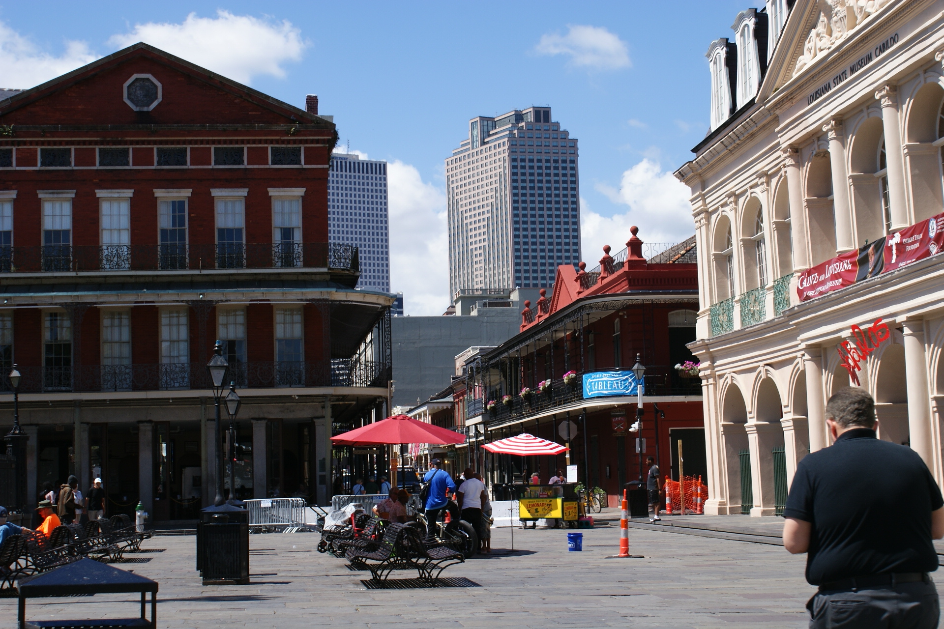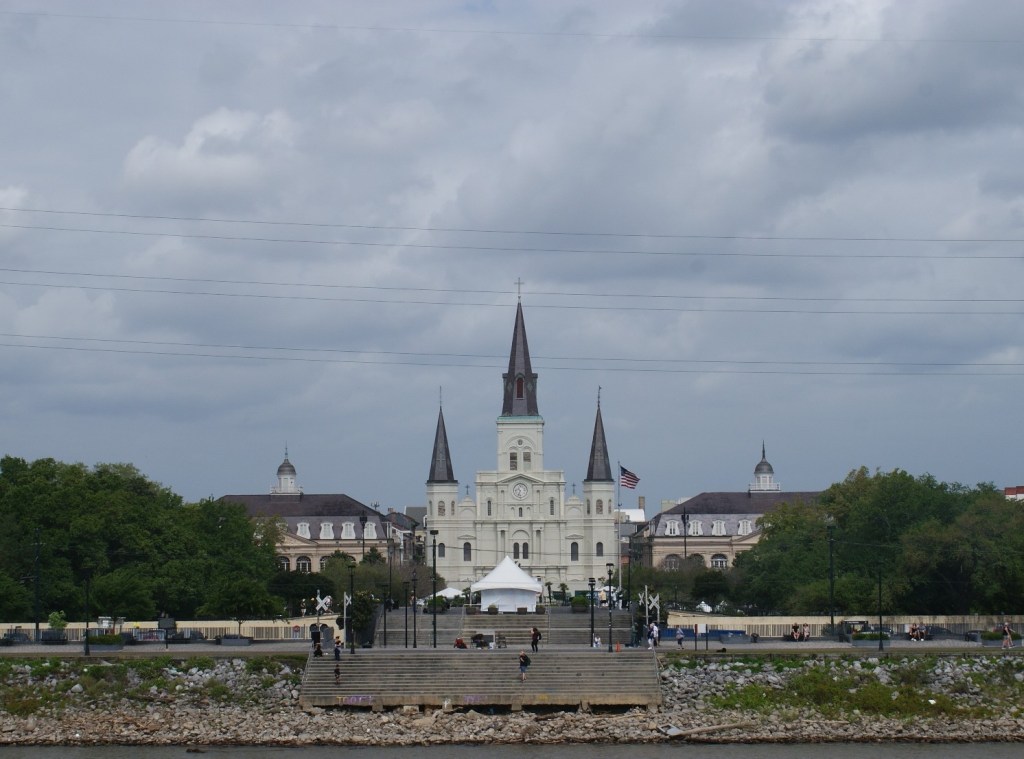 Nous découvrons une statue de Jeanne d’Arc, don de la ville d’Orléans en France et qui est fêtée ici simplement pour honorer la France, car elle n’a historiquement rien à voir avec cette ville, si ce n’est qu’elle a délivré Orléans. Nous prenons un café au renommé « Café du monde ». Nous arrivons au Jackson Square que nous ne pouvons malheureusement pas visiter car il est fermé, un festival de jazz du Vieux Carré a lieu dans deux jours et la ville est en pleine préparation.