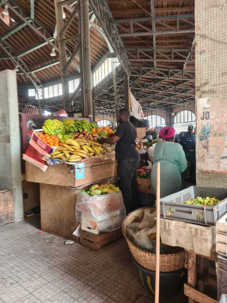 Notre premier jour de visite de Dakar, nous reprenons un taxi qui nous amène au marché Kermel. Une grande halle très animée avec, au centre, les étals de poissons peu engageants qui exhalent une odeur très désagréable, et autour, les étals bariolés et très fournis de fruits et légumes. On peut à peine circuler entre les allées. A la sortie du marché nous sommes alpagués par les vendeurs de toutes sortes de souvenirs africains. Ils ne sont pas trop insistants, il suffit de dire non fermement et avec le sourire. Certains engagent la conversation pour savoir si nous venons de la vraie France, puis on fait une petite plaisanterie sur le prochain match où le Sénégal joue pour la coupe d’Afrique et on est amis !