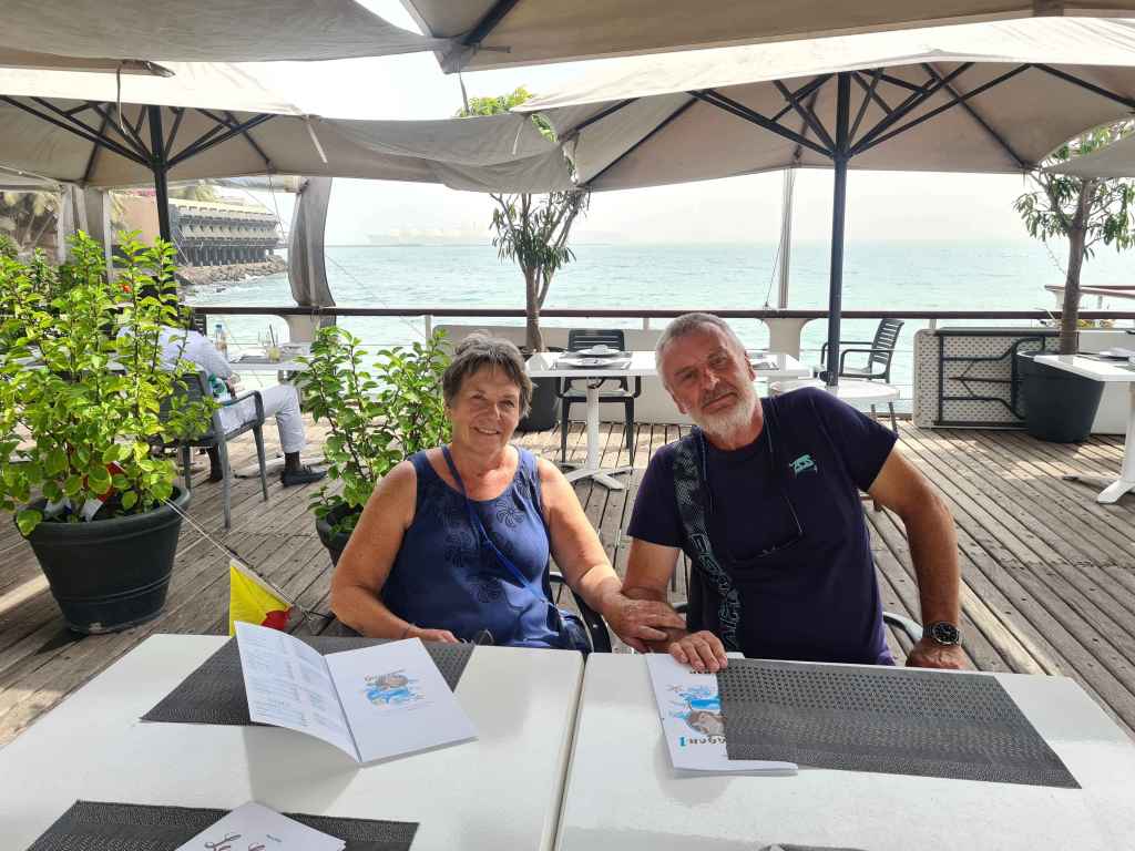 Nous reprenons nos habitudes au CVD. Un aller-retour vite expédié à Dakar pour faire tamponner nos passeports. Nous retrouvons la même ambiance dilettante au bureau de l’immigration que la semaine dernière. Nous faisons le plein au supermarché Casino de Dakar bien approvisionné en produits français, en prévision de la transat, sachant qu’au Cap Vert on ne trouve pas tout. Nous trainons, prenons nos repas au CVD, remettons le bateau en mode traversée. Alors que nous sirotons une bière au bar, un monsieur nous aborde nous demande si nous n’allons pas au Cap Vert par hasard. Il est descendu en camping-car depuis la France avec sa petite fille qui cherche à gagner Mindelo où elle va travailler pour une O.N.G. Tous les deux ont de beaux projets et sont bien sympathiques, nous acceptons d’embarquer Coline à condition qu’elle se mette en règle avec les autorités pour la sortie du territoire. Il faut faire vite, nous sommes vendredi et tout est fermé le week-end.