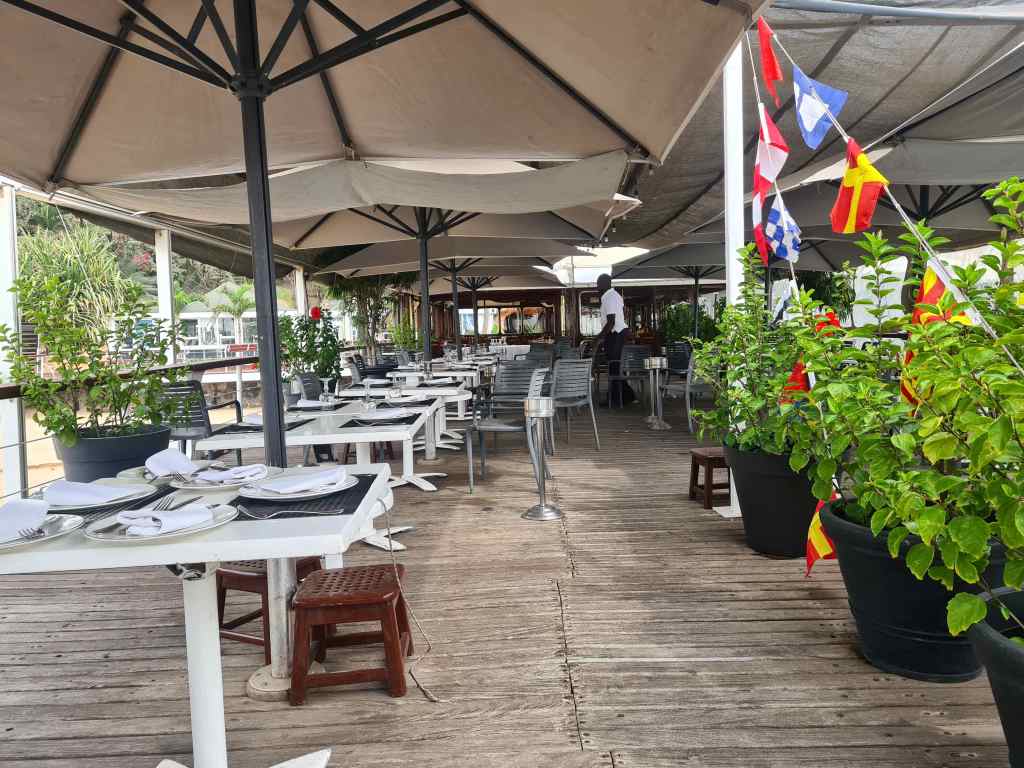 Nous rentrons plutôt déçus au bateau et décidons donc d’aller mouiller ailleurs. Un peu en amont nous posons notre ancre devant un hôtel : Hakuna Lodge. Nous pouvons profiter de la soirée en sirotant une bière sur une terrasse propre face à la rivière elle-même propre et propice à la baignade. Quel bonheur ! Le personnel du lodge, très accueillant,re nous prend nos poubelles nous propose de prendre une douche dans leurs installations, nous pourrions également faire de plein l’eau si besoin.