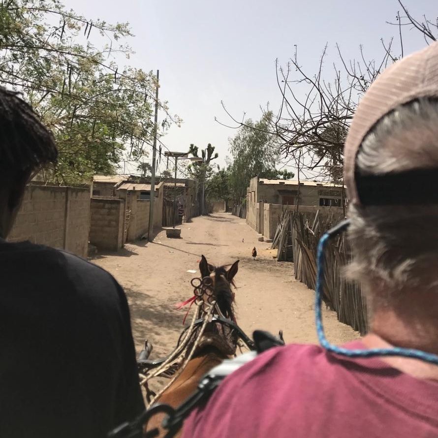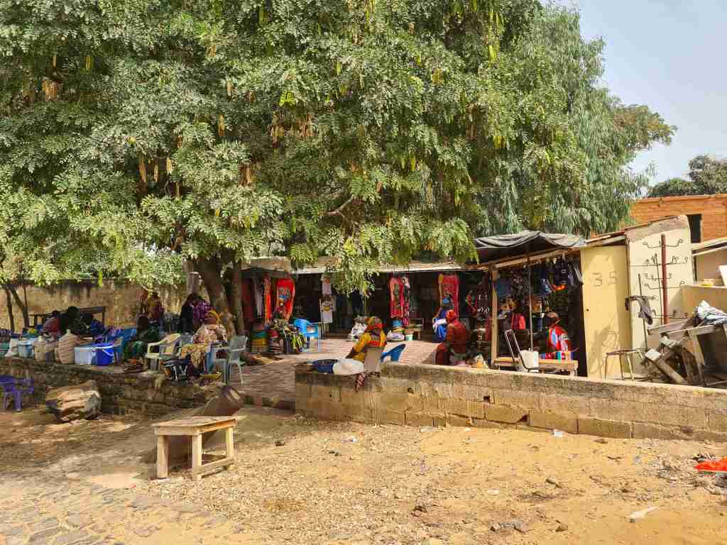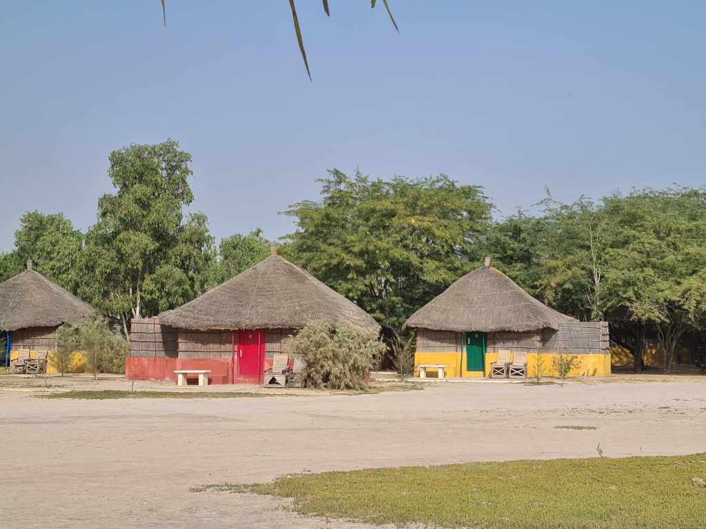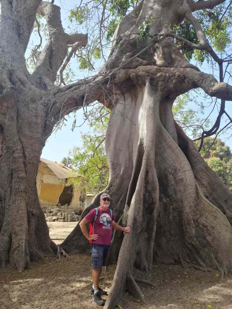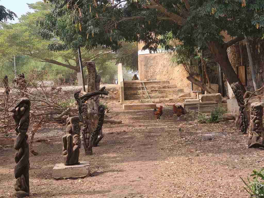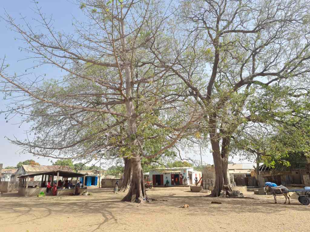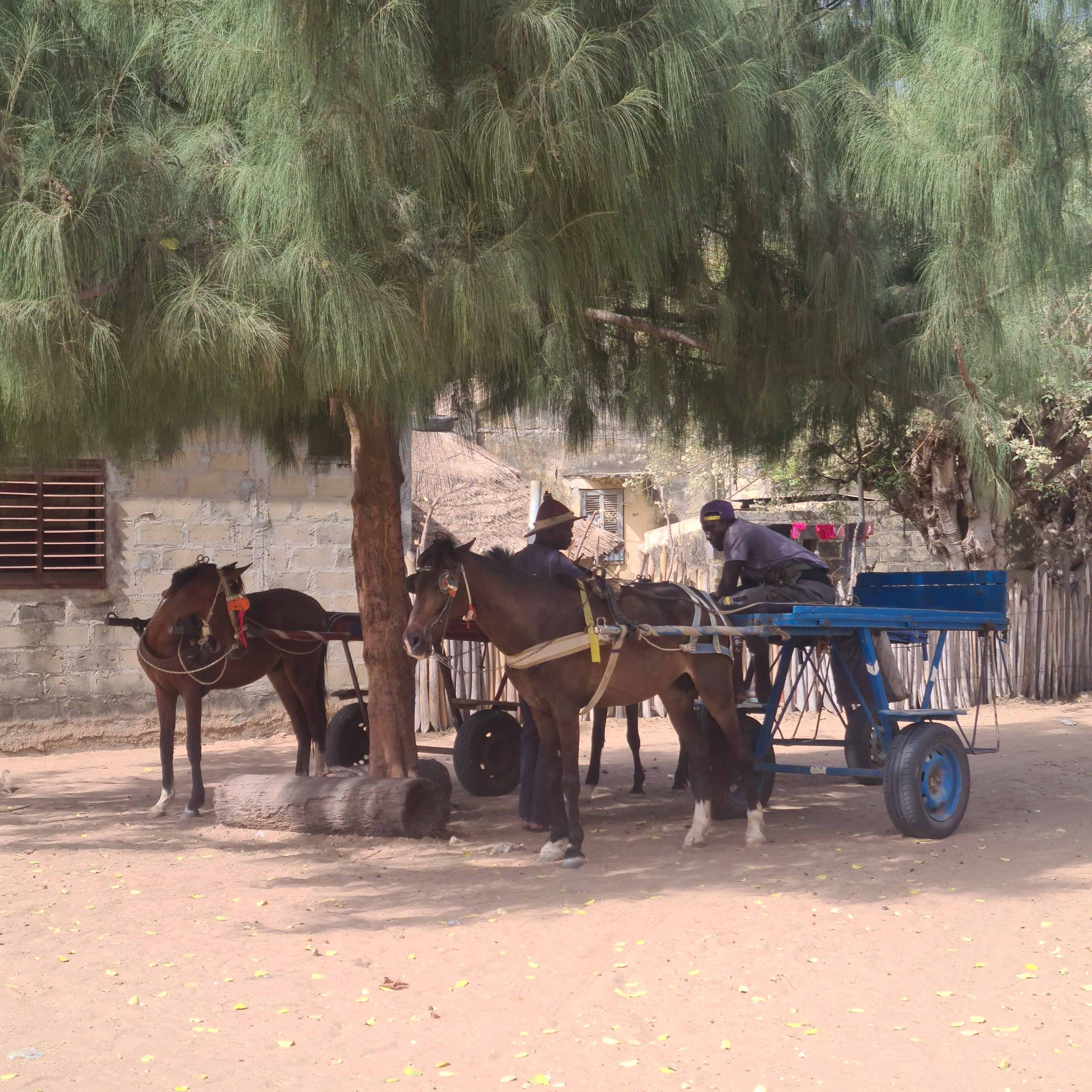 Nous suivons une piste de sable dans une lande plate, plantée d’herbe sèche, d’eucalyptus de quelques baobabs et autres épineux, nous traversons des zones de marais plus ou moins asséchés. Avant de voir les maisons, la proximité du village est signalée par la présence de détritus divers et variés dans la nature. Le village de Mar Lodj est visité par des touristes et son activité en est affectée. Nous sommes accueillis par un guide qui, sans rétribution, nous fait faire le tour du village et nous en explique la vie. Les trois religions catholique, musulmane et animiste cohabitent, avec une mosquée et une église. Il nous montre l’arbre de la fraternité symbolisé par deux arbres entrelacés l’un à l’autre au pied duquel est rendue la justice encore aujourd’hui. L’arbre de circoncision et de l’initiation où se déroulaient les rites initiatiques, le marché, les étals artistiques. Il prend congé en nous remerciant de nos achats de confitures et objets artistiques et nous organise le retour en calèche au lodge. Un moment bien sympathique dans un village typique et propre.