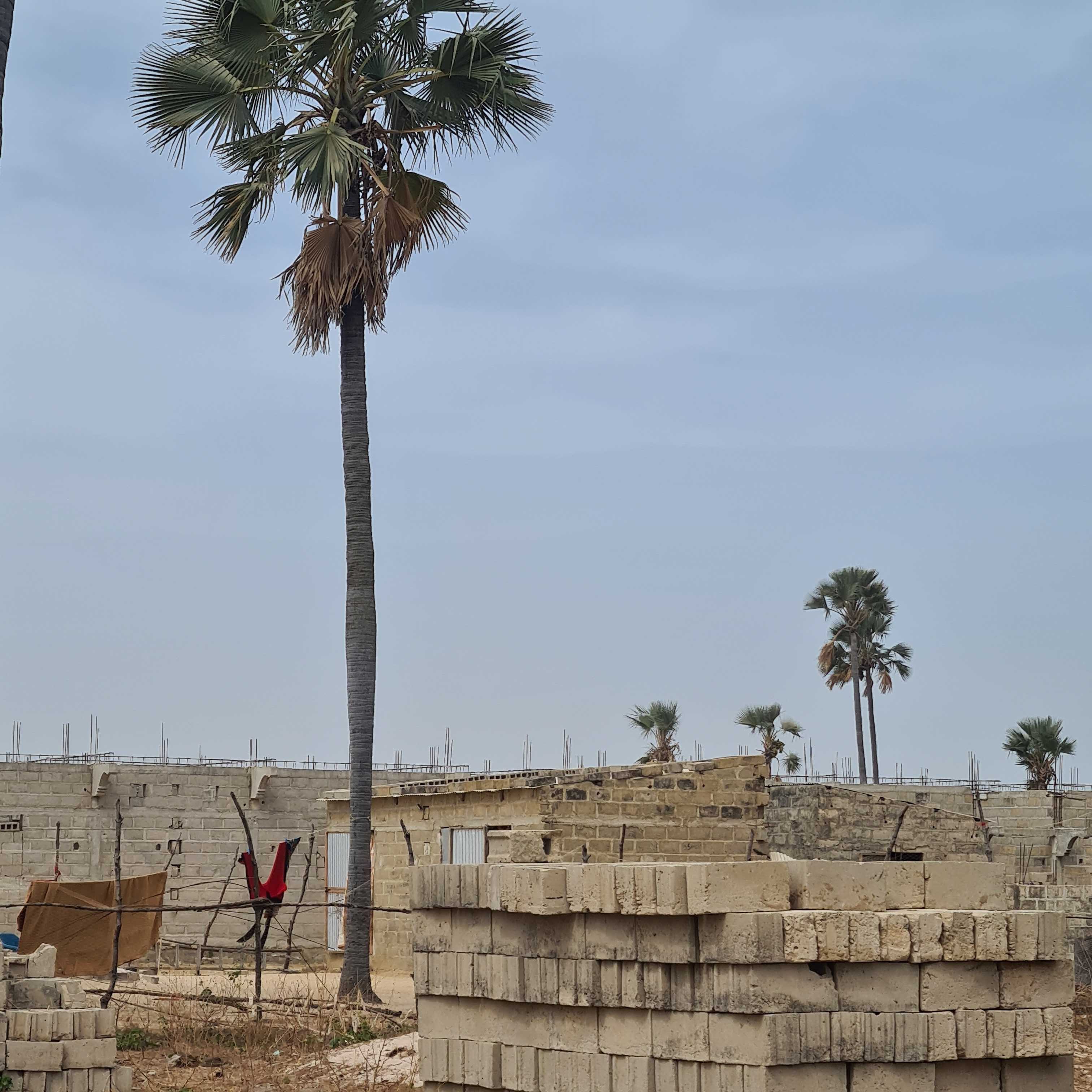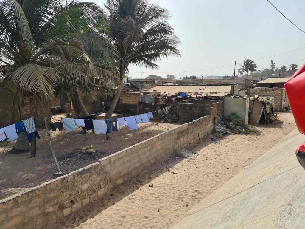 Le lendemain, nous entreprenons, après avoir gonflé notre annexe, d’aller un jeter un coup d’œil au village espérant trouver un peu autre chose qu’en ville. Grosse déception ! Nous débarquons sur une plage jonchée de débris en plastique, qui semble privée et demandons l’autorisation de laisser notre annexe sur la plage aux gars qui travaillent sur le lieu : « Pas de problème, tu me donnes 2000 CFA ! ». Sur la route qui rejoint le village, nous longeons, sur un côté la plage avec des meutes de chiens errants, des chèvres, et de l’autre des maisons misérables sans toit pour la plupart : quatre murs en parpaings, une cour avec des chèvres et du linge qui sèche. Le village n’a rien à envier à notre village de pêcheurs de Dakar. C’est tout aussi sale et puant.