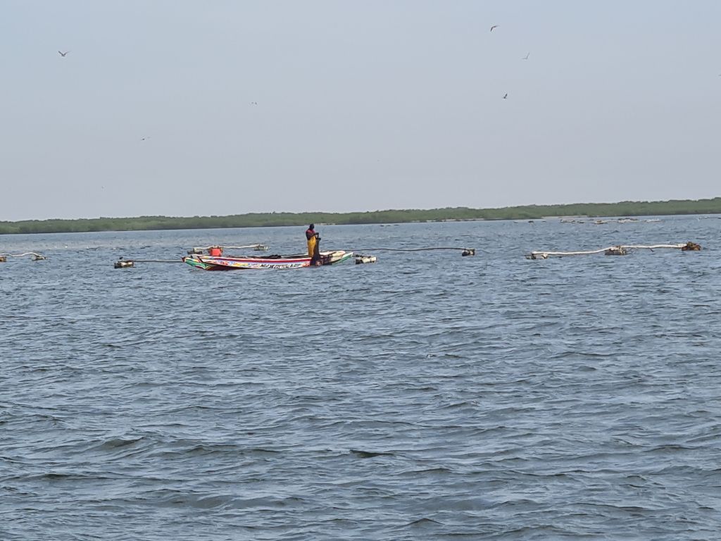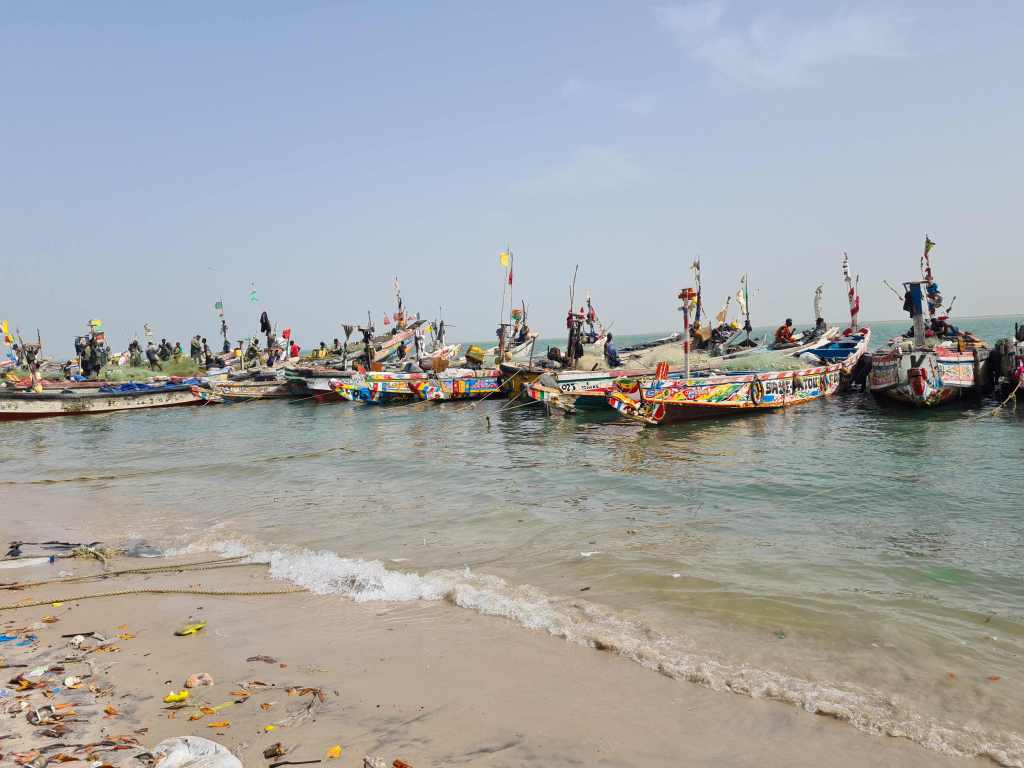 Nous partons très tôt, il fait encore nuit, pour pouvoir arriver de jour à l’embouchure du fleuve Saloum qui est réputée délicate et surtout non éclairée. Nous trouvons notre chemin, de nuit, entre les nombreux cargos et tanker au mouillage dans la baie de Hann. Puis la journée nous devons également souvent dévier notre route pour éviter les filets et zones de pêche. Sur les 65 milles de navigation il n’y pas une zone où la pêche n’est pas pratiquée, cela grouille de barques de pêcheurs. Ce sont de grandes barques bariolées d’au moins 10 mètres où ils sont très nombreux pour remonter des filets très grands et chargés en poisson. Ils pêchent souvent à plusieurs barques : une plus petite avec un seul homme à bord semble tendre le filet.
