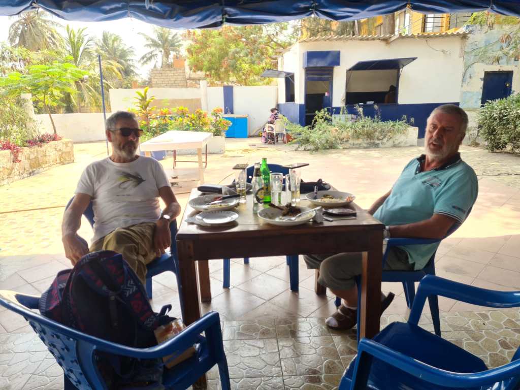 Nous rencontrons les divers intervenant du Club. Il y a Abdou qui nous propose de faire le plein d ‘eau, un autre qui est responsable des carburants, mama lessive, mama nougat qui vend de la bonne nougatine aux cacahouètes, des pralines ou des cacahouètes salées délicieuses, mama couture qui propose de drapeaux de tous les pays ou des vêtements sur mesure, etc… Comme c’est dimanche nous devons attendre le lendemain pour faire les formalités. Partis pour faire une première découverte nous sommes alpagués par une bande d’expatriés qui se retrouvent tous les dimanches au bar du Club. Nous passons une agréable fin d’après-midi en leur compagnie : ils nous apprennent leur Afrique.