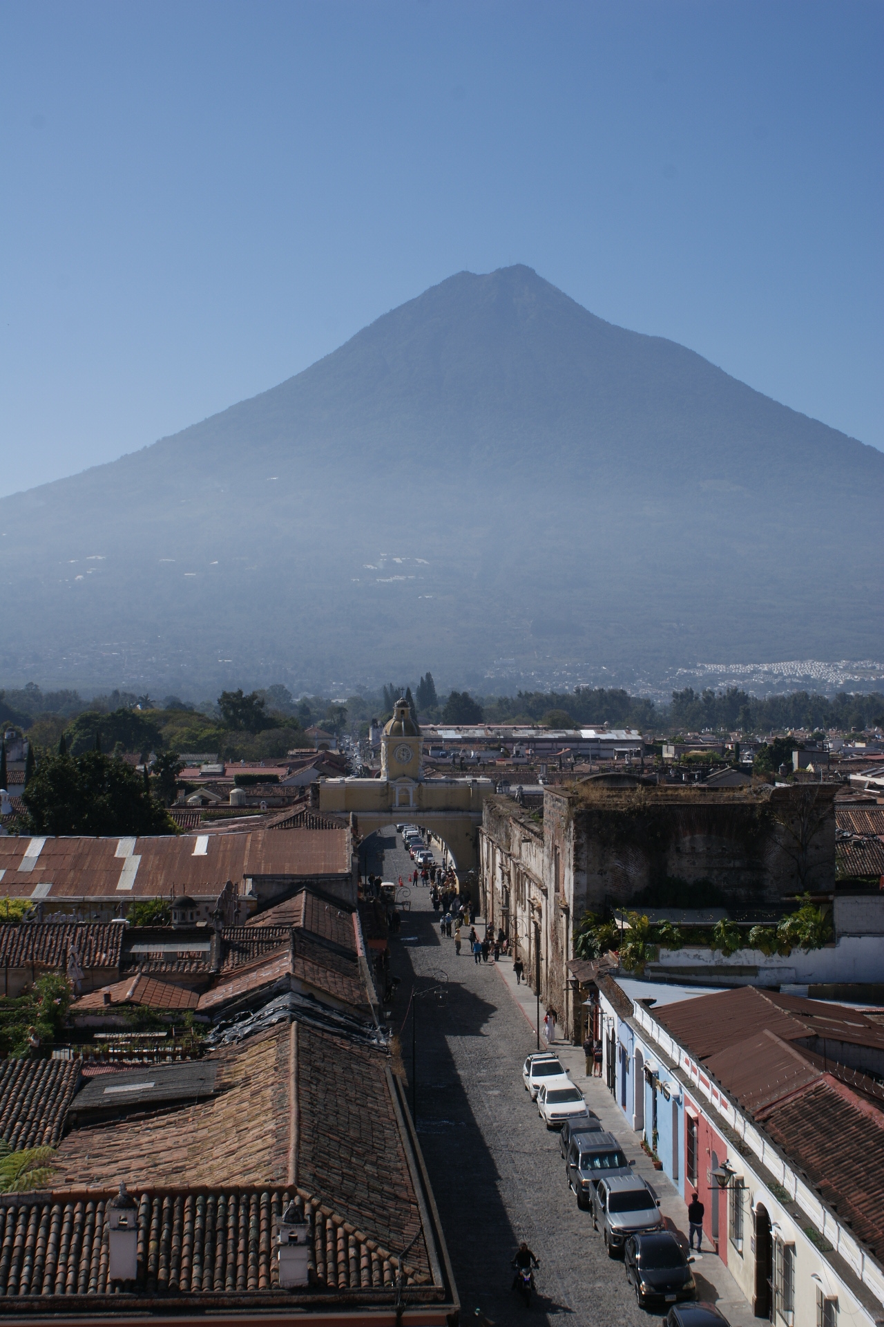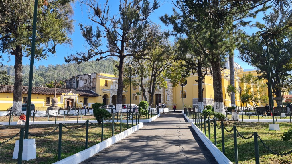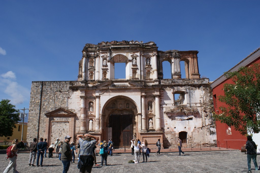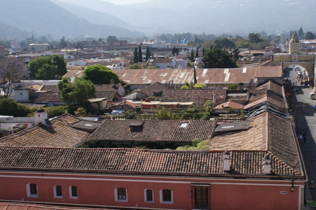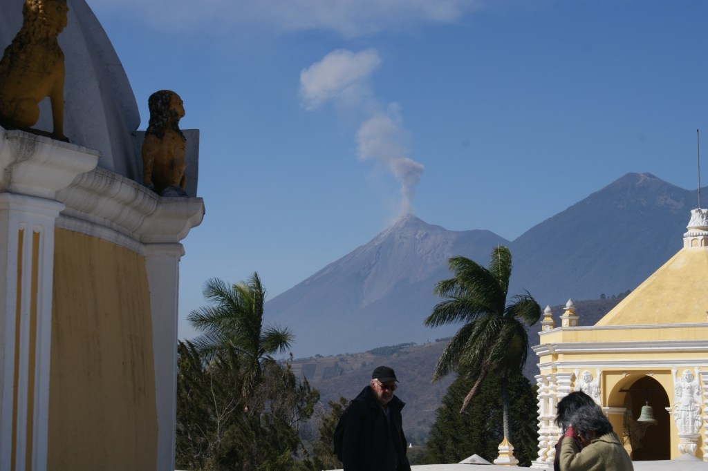 La ville d’Antigua ancienne capitale du pays est une petite ville aux réseaux de rues pavées perpendiculaires et au caractère fortement hispanique. En une journée on en fait facilement le tour. Nous commençons par déambuler dans le marché où se mêlent des étals de fruits, légumes, boucherie, genre de quincaillerie où l’on trouve de tout, produits de toilette, et évidement étoffes locales et autres vêtements ou babioles pour touristes. Au centre de la ville se trouve un grand parc au centre d’un place bordée de bâtiments administratifs et d’arcades, qui abritent quelques cafés et magasins. De nombreuses églises et anciens couvents sont répartis un peu partout dans la ville, très souvent dans un piteux état car détruits par les éruptions volcaniques ou séismes récurrents. C’est d’ailleurs pour cette raison que la capitale a été déplacée au 18eme siècle. Certaines églises comme la Cathédrale St Joseph ou l’Eglise de la Merced ont été restaurées dans leur style fortement baroque. Depuis les toits de l’ancien couvent qui jouxte l’Eglise on peut admirer la ville et les volcans qui l’entourent ; l’un d’eux crachote encore un peu ce matin signe de cette forte activité sismique.