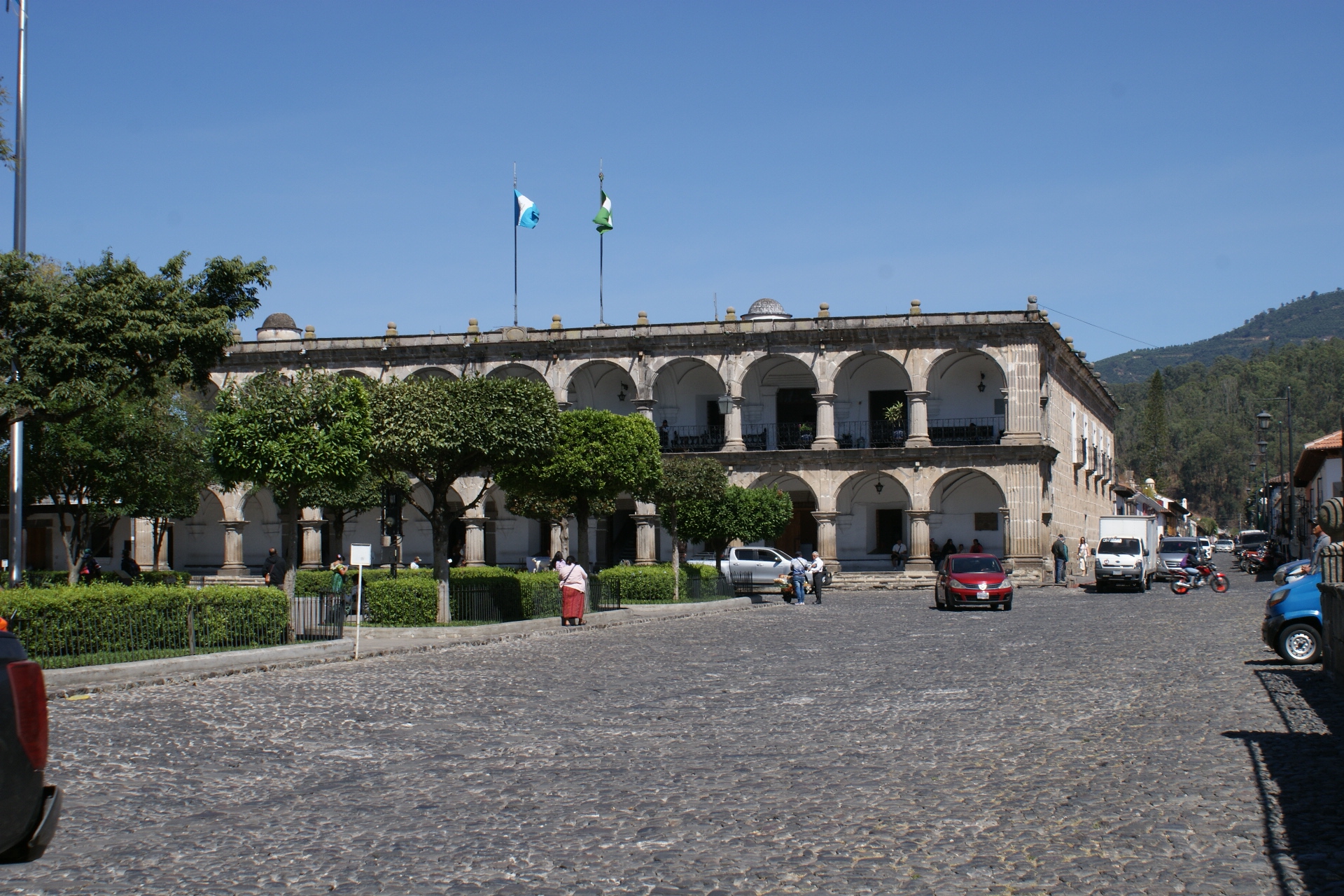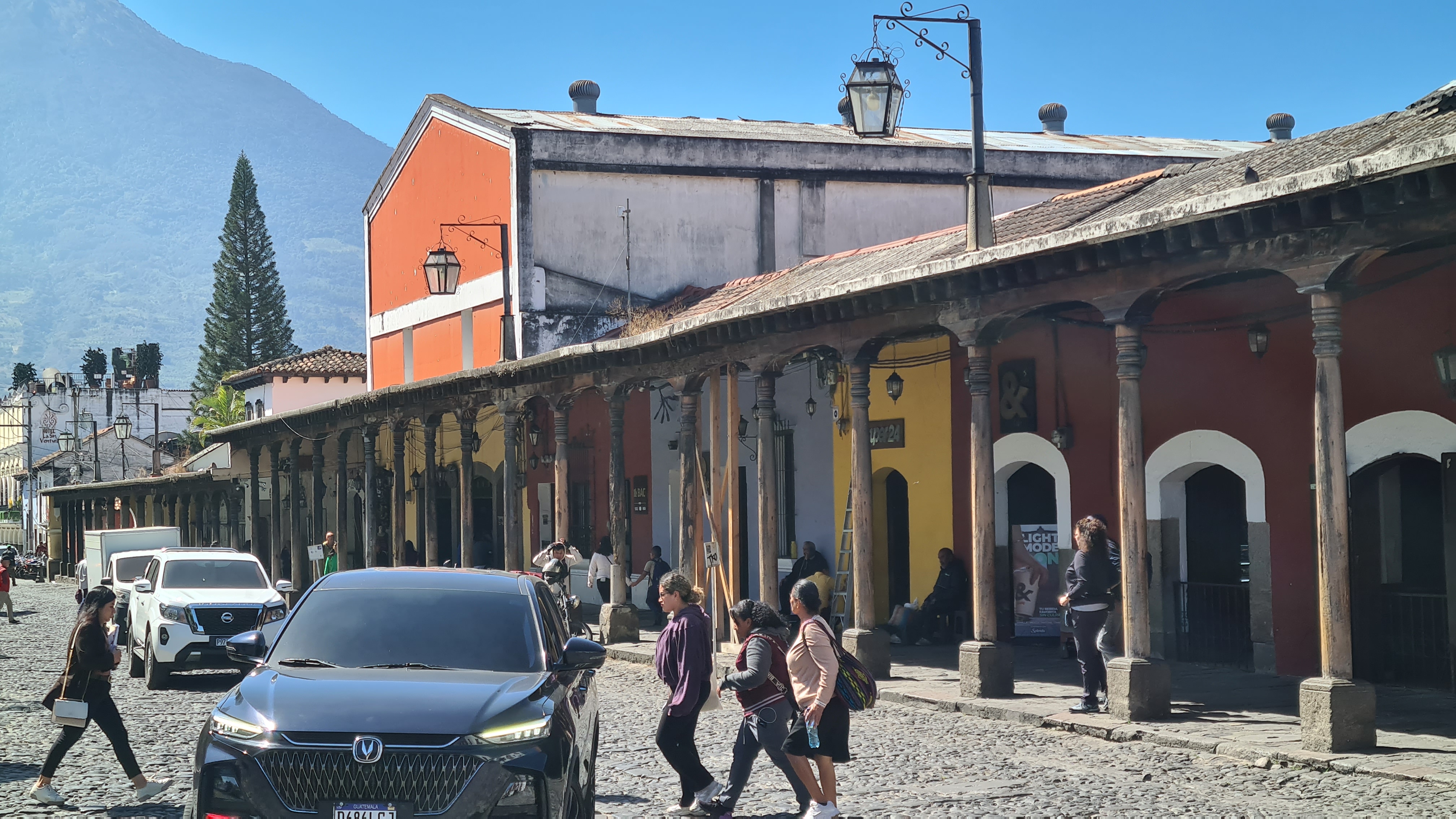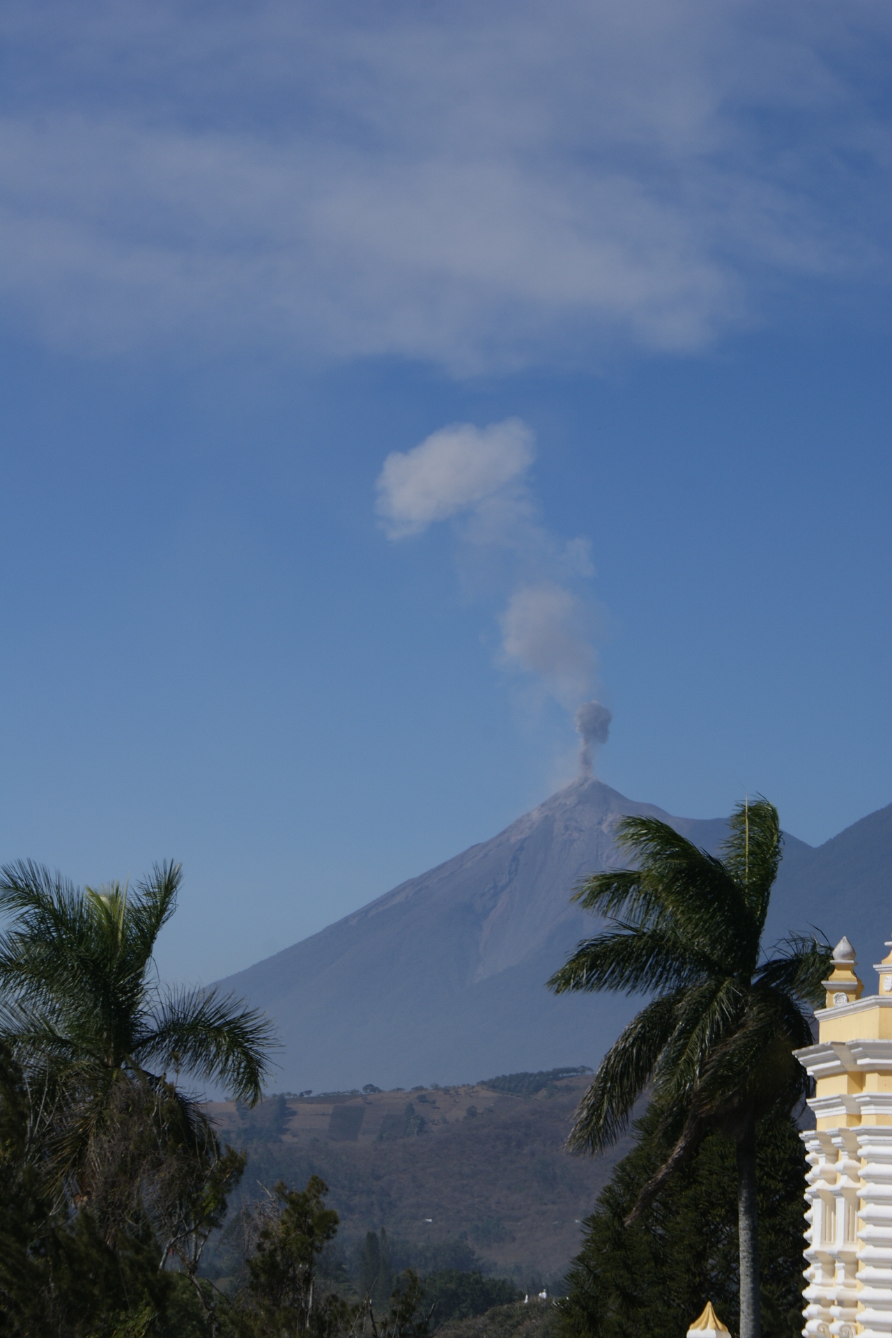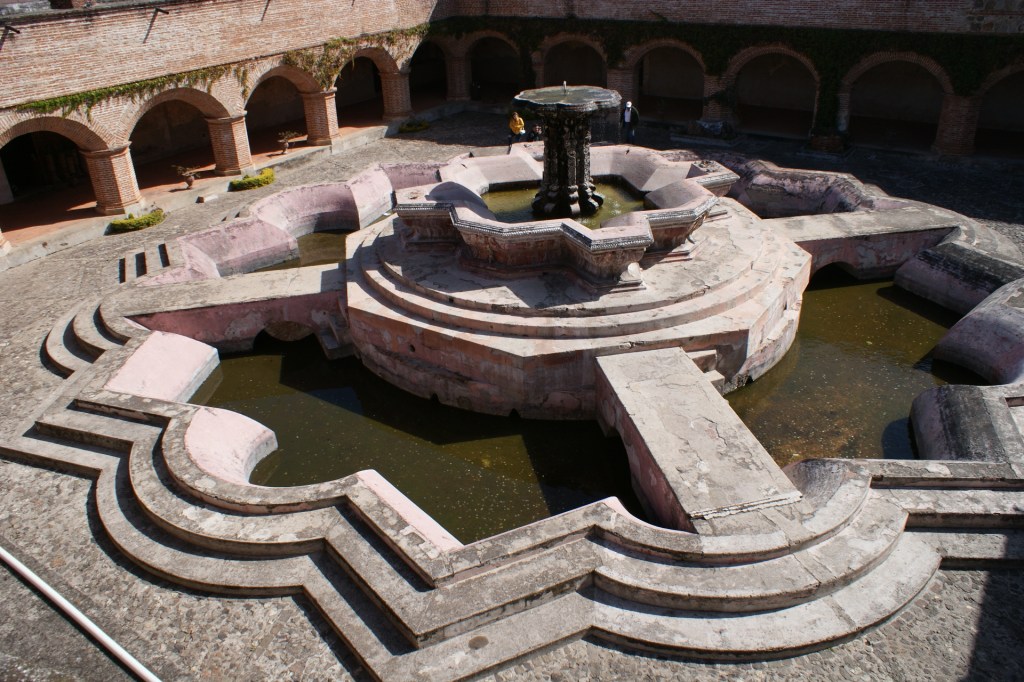 La ville d’Antigua ancienne capitale du pays est une petite ville aux réseaux de rues pavées perpendiculaires et au caractère fortement hispanique. En une journée on en fait facilement le tour. Nous commençons par déambuler dans le marché où se mêlent des étals de fruits, légumes, boucherie, genre de quincaillerie où l’on trouve de tout, produits de toilette, et évidement étoffes locales et autres vêtements ou babioles pour touristes. Au centre de la ville se trouve un grand parc au centre d’un place bordée de bâtiments administratifs et d’arcades, qui abritent quelques cafés et magasins. De nombreuses églises et anciens couvents sont répartis un peu partout dans la ville, très souvent dans un piteux état car détruits par les éruptions volcaniques ou séismes récurrents. C’est d’ailleurs pour cette raison que la capitale a été déplacée au 18eme siècle. Certaines églises comme la Cathédrale St Joseph ou l’Eglise de la Merced ont été restaurées dans leur style fortement baroque. Depuis les toits de l’ancien couvent qui jouxte l’Eglise on peut admirer la ville et les volcans qui l’entourent ; l’un d’eux crachote encore un peu ce matin signe de cette forte activité sismique.