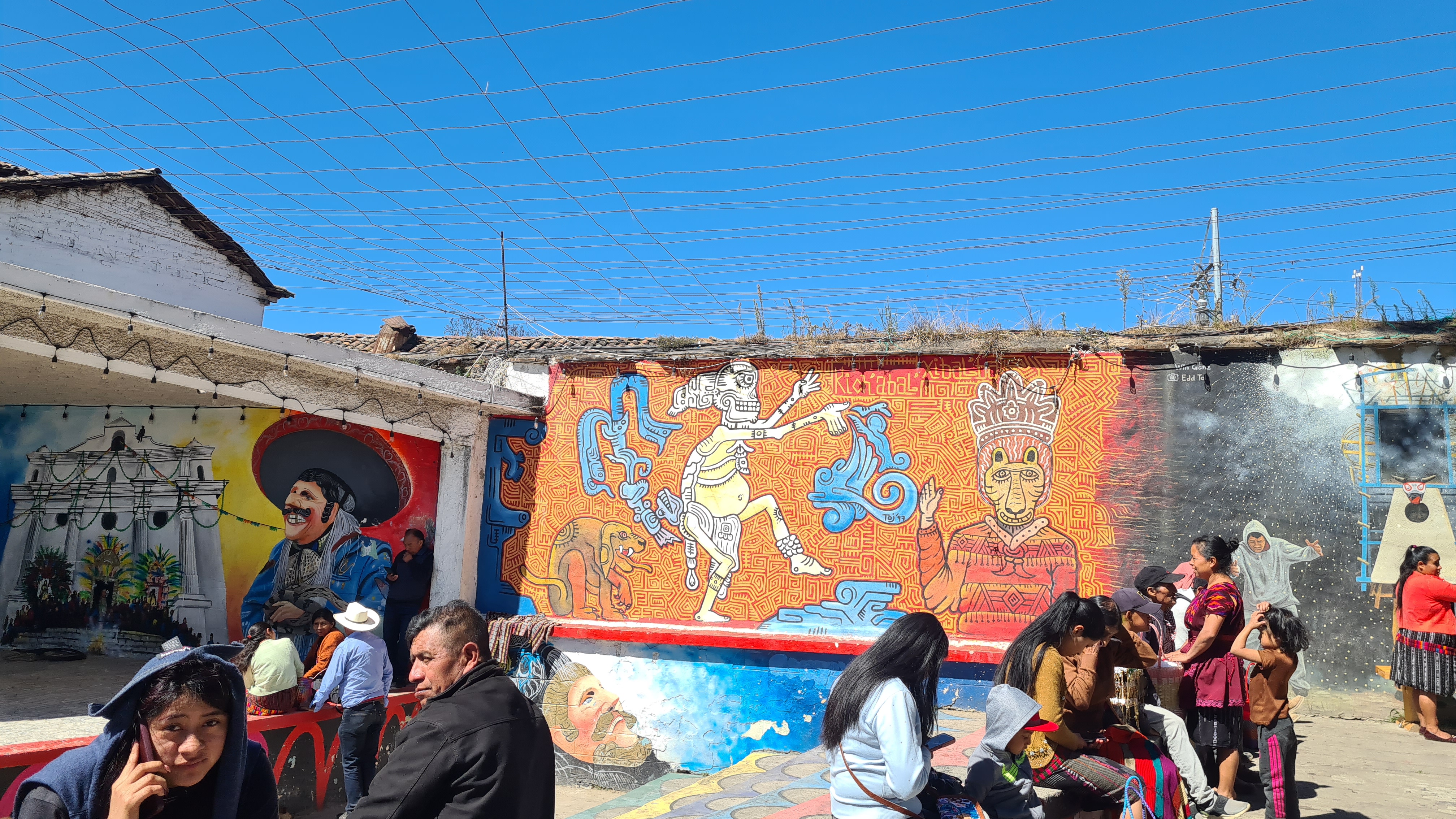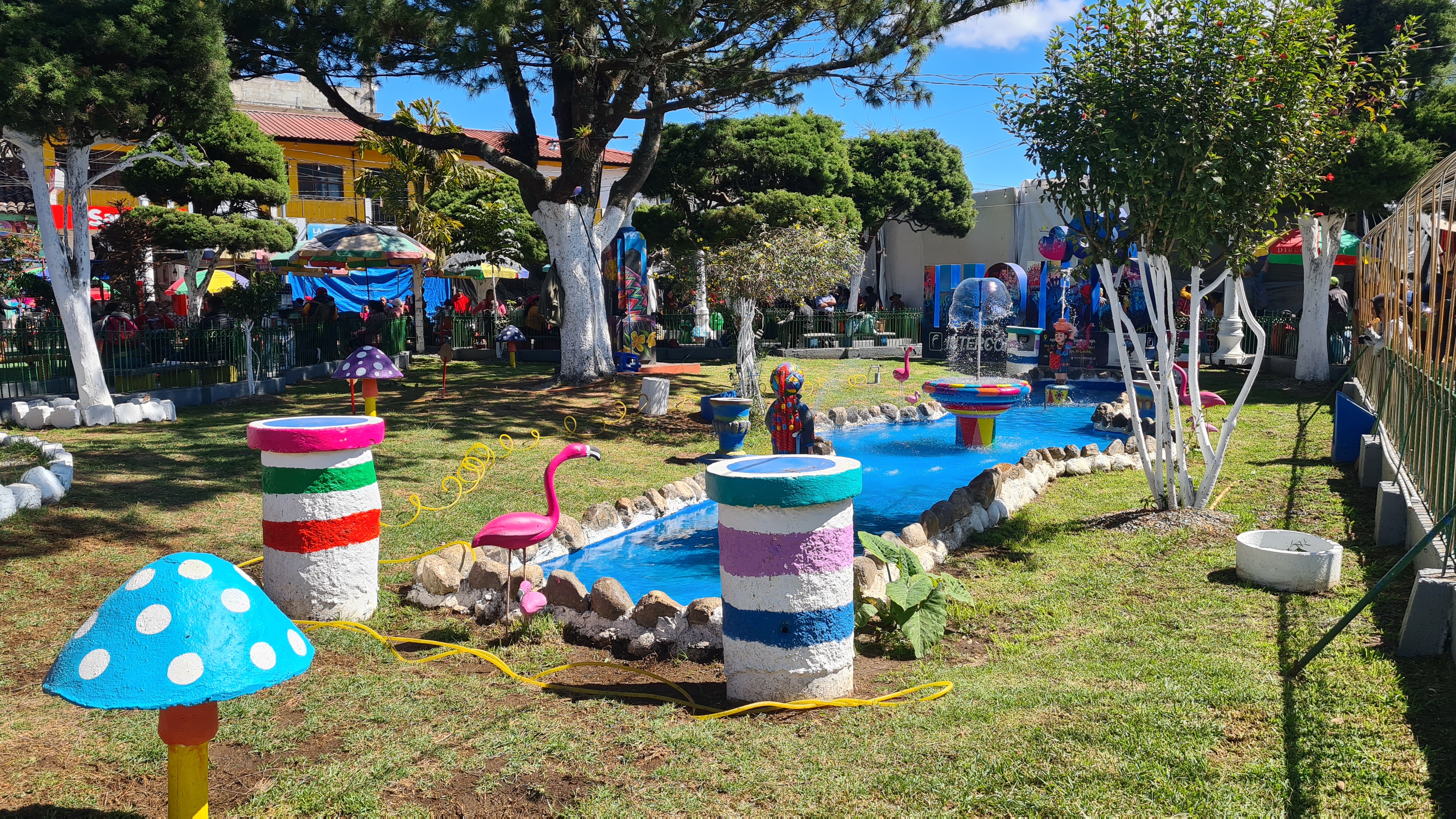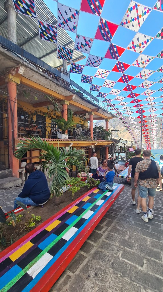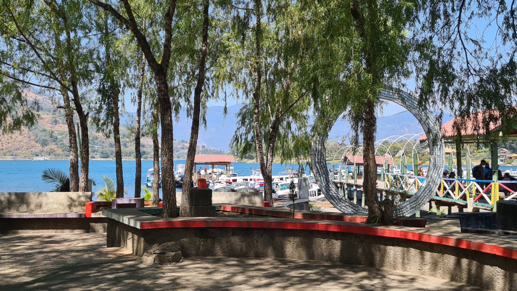 Nous passons trois nuits à Panajachel. Le premier jour nous reprenons un bus qui nous amène le matin au marché de Chichicastenango, réputé pour ses couleurs. Nous sommes un peu déçus, le marché s’étend dans un village qui n’a rien de charmant si tant est que les villages soient charmants ici ! Il est très étendu et n’attend que les touristes. Hormis une petite place avec des peintures murales et des jeux pour les enfants aux couleurs locales, le site ne présente pas vraiment d’intérêt. Certes les couleurs des étoffes et des vêtements sont belles comme partout ici, mais nous regrettons un peu d’avoir fait trois heures de bus pour cela. Heureusement le jardin calme de l’hôtel et la jolie plage de Panajachel nous permettent de nous reposer un peu.