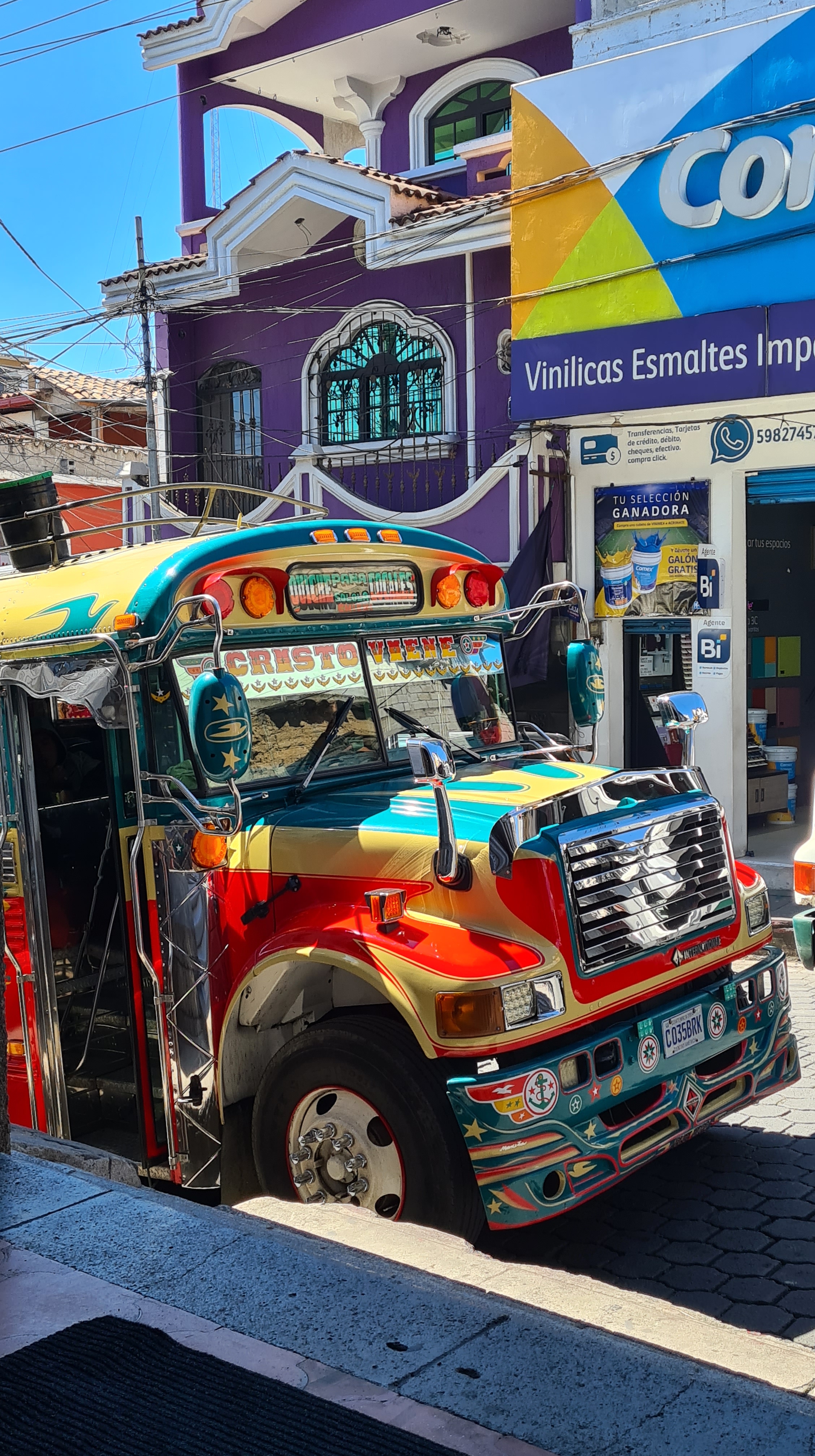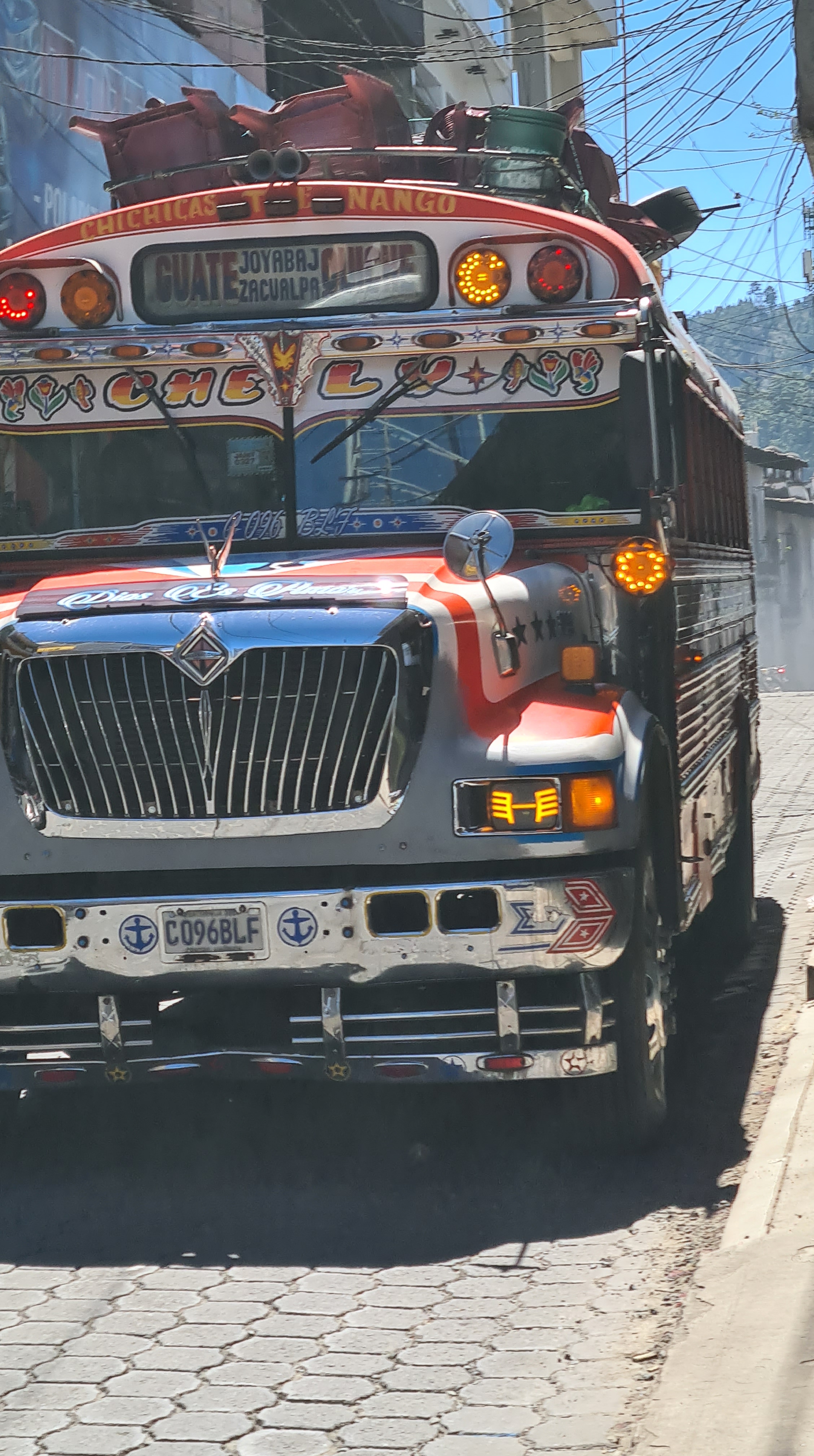 Le 4 février nous redécouvrons les transports guatémaltèques. Nous réservons un « shuttle » pour Panajachel, ville touristique située au bord du beau lac Attitlan. Par « shuttle » on entend un système de transport réservé aux touristes, un peu plus confortable et normalement rapide que les bus locaux. Les bus locaux sont voisins des bus américains de transports scolaires, peints de couleurs vives et voyantes. Les « shuttles » sont des bus de tailles variables et plus confortables, et plus ou moins à l’heure. Il faut dire que tous les transports se font par la route, sur un réseau plus que vétuste et dans un pays montagneux. Les routes sont très encombrées d’énormes camions à l’américaine, de voitures, de bus, de motos… En l’occurrence le bus que nous empruntons cette fois ci est un van d’une dizaine de places où nous nous entassons tant bien que mal, les bagages sont ligotés sur le toit, et le chauffeur conduit à fond doublant n’importe où, à la mode locale. Nous sommes bien aise d’aborder la descente sur le lac Atitlan en fin d’après-midi. Heureusement ce van sera le pire des transports que nous allons emprunter.