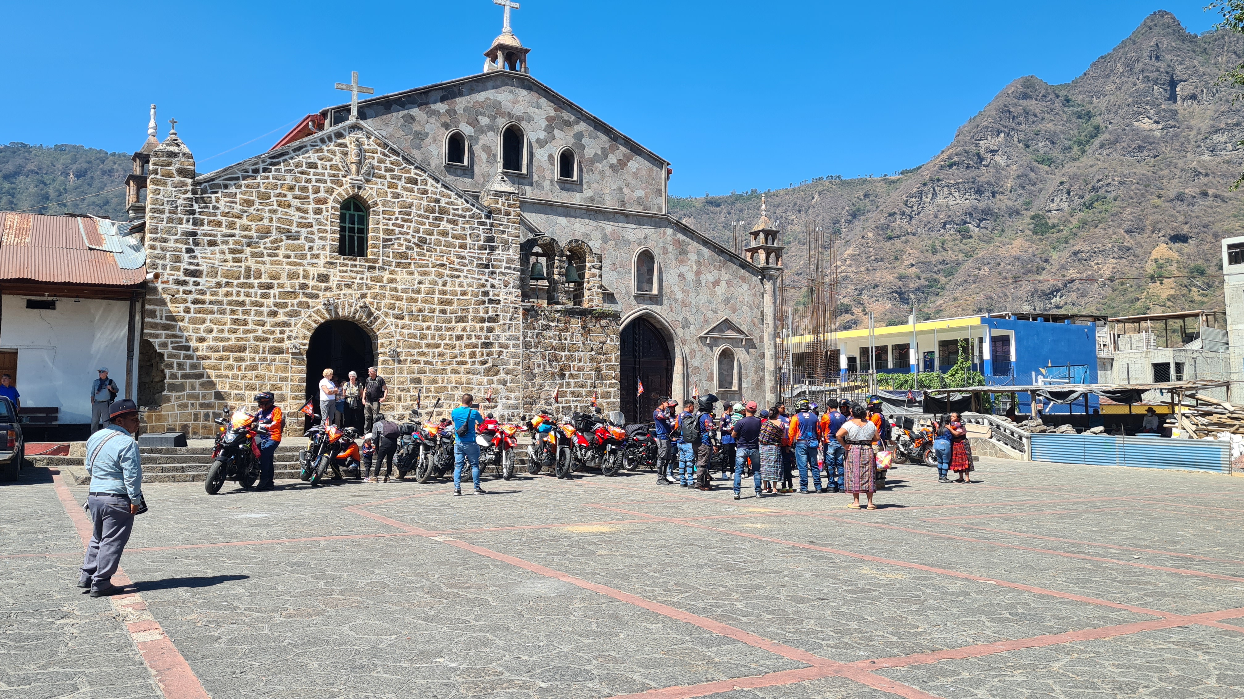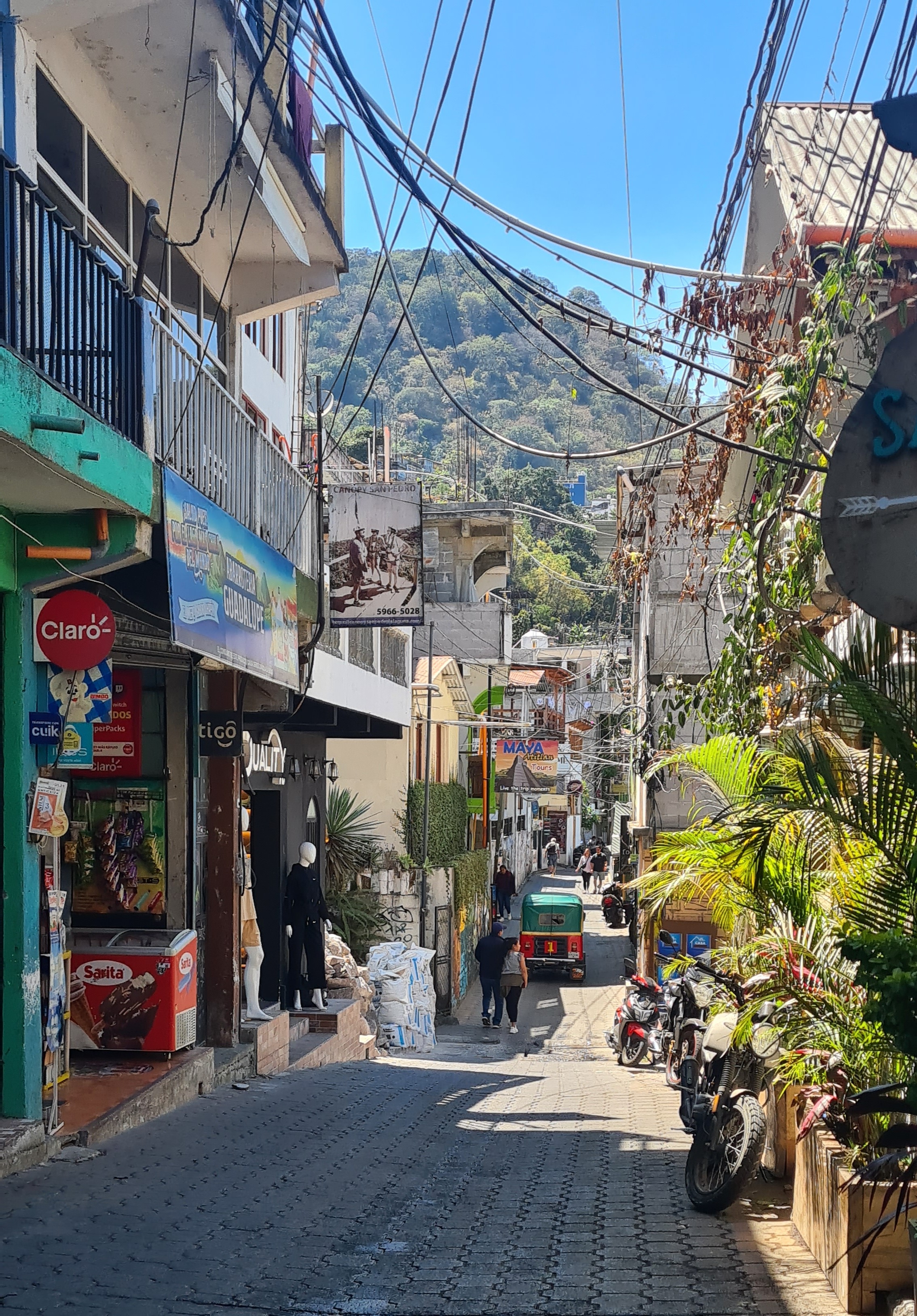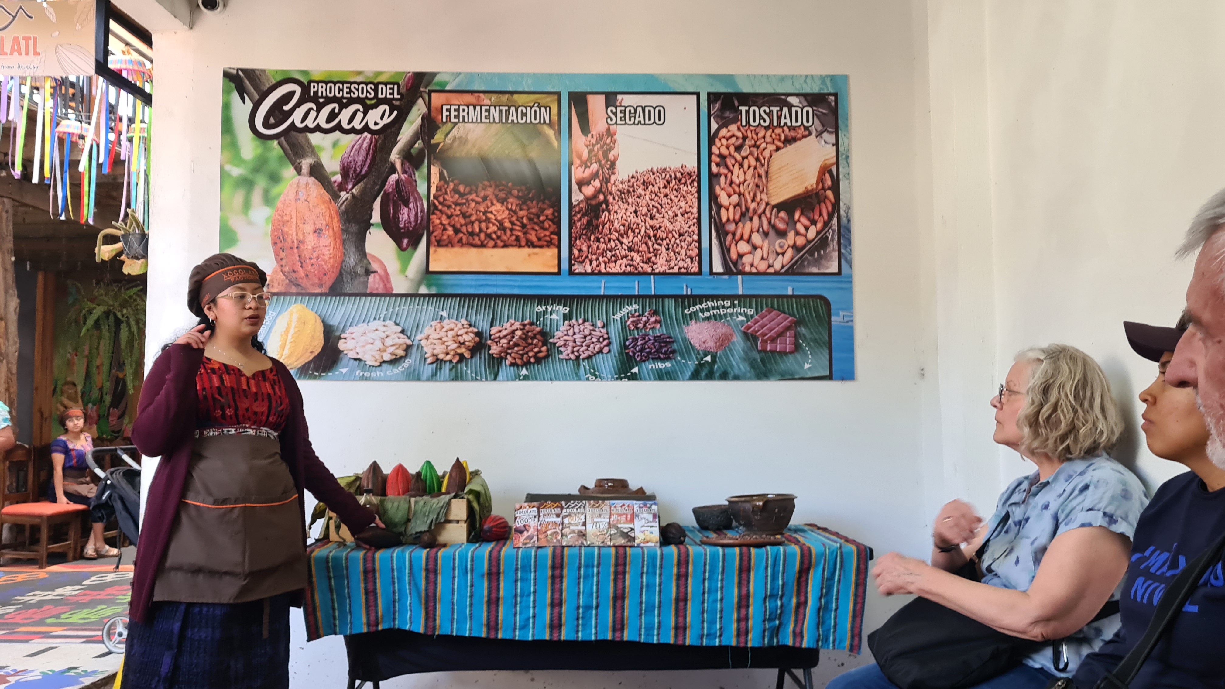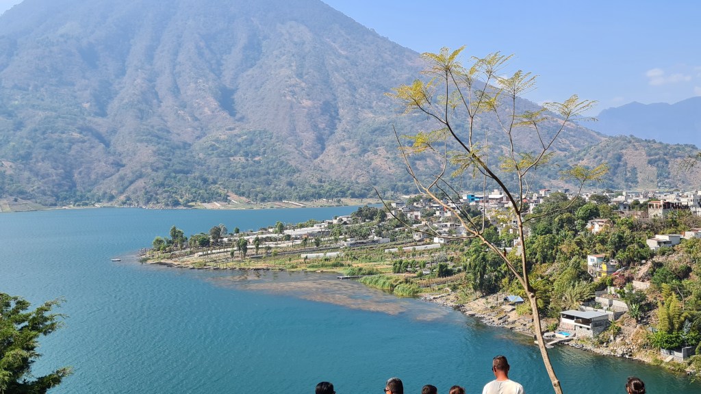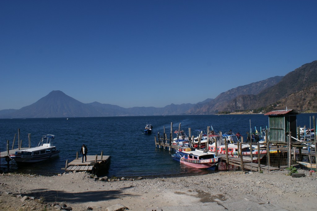 Le lendemain nous partons en excursion sur le lac. Nous empruntons une lancha (barque locale) avec une guide et trois autres touristes. La guide d’origine Maya nous montre les jolis villages mayas de San Juan et San Pedro de la Laguna, et Santiago et qui sont accrochés au bord du lac et dont l’accès est plus facile par l’eau que par la route. Nous visitons une fabrique de chocolat, une unité de production de miel où nous sommes étonnés par la forme minuscule des abeilles et nous assistons à une démonstration de transformation artisanale de fleurs de coton en tissus colorés naturellement, spécialité du pays. Nous assistons au départ d’une course de moto. Nous empruntons un tuk-tuk, autre moyen de transport local pour monter sur les hauteurs admirer un joli point de vue sur le lac.