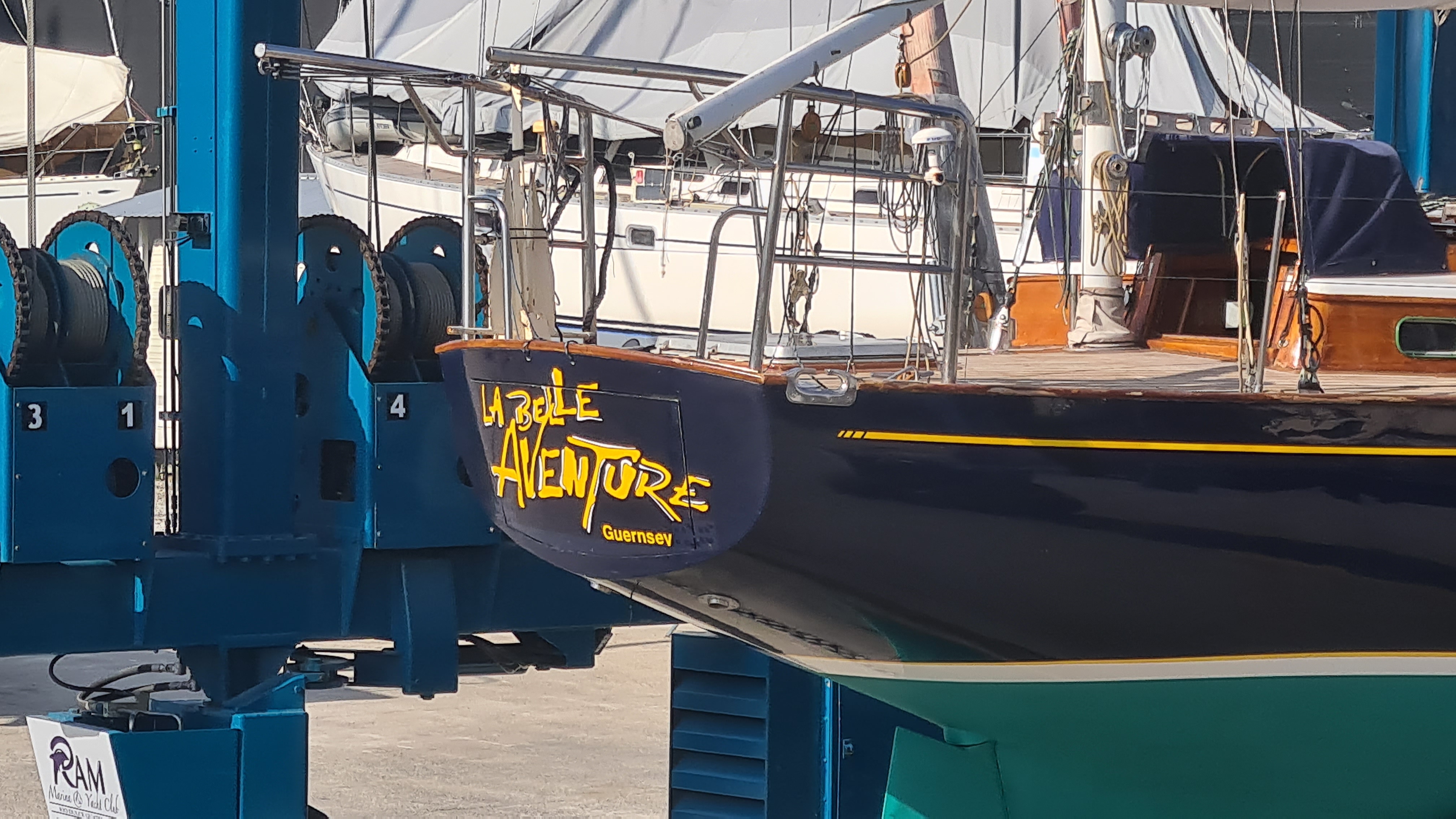 Nous planifions avec le personnel de la Marina la date du carénage, et de la remise à l’eau. Tellement enthousiasmés par l’aspect tout neuf de notre bateau, nous leur demandons de nettoyer la coque un peu grisouille.