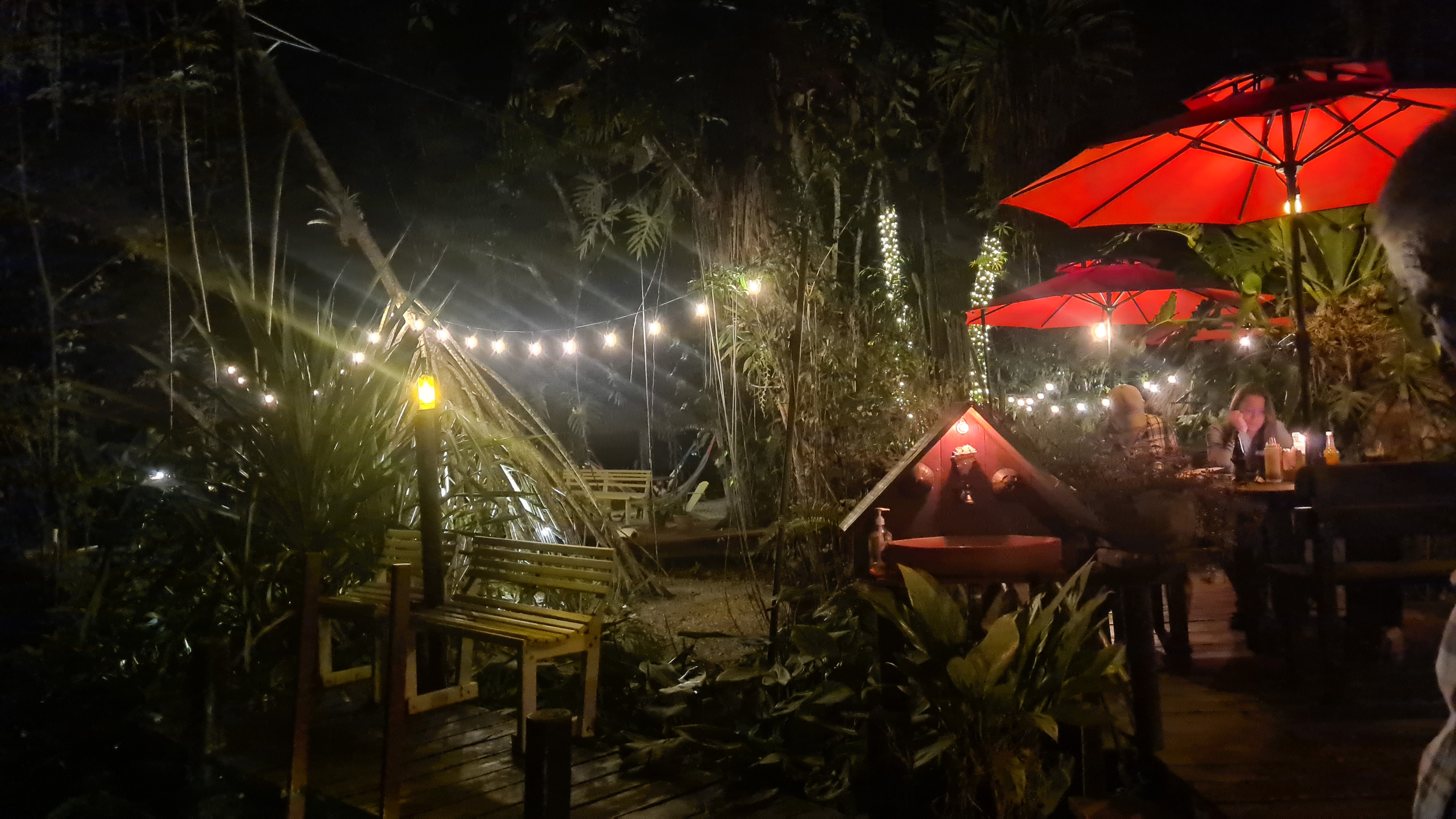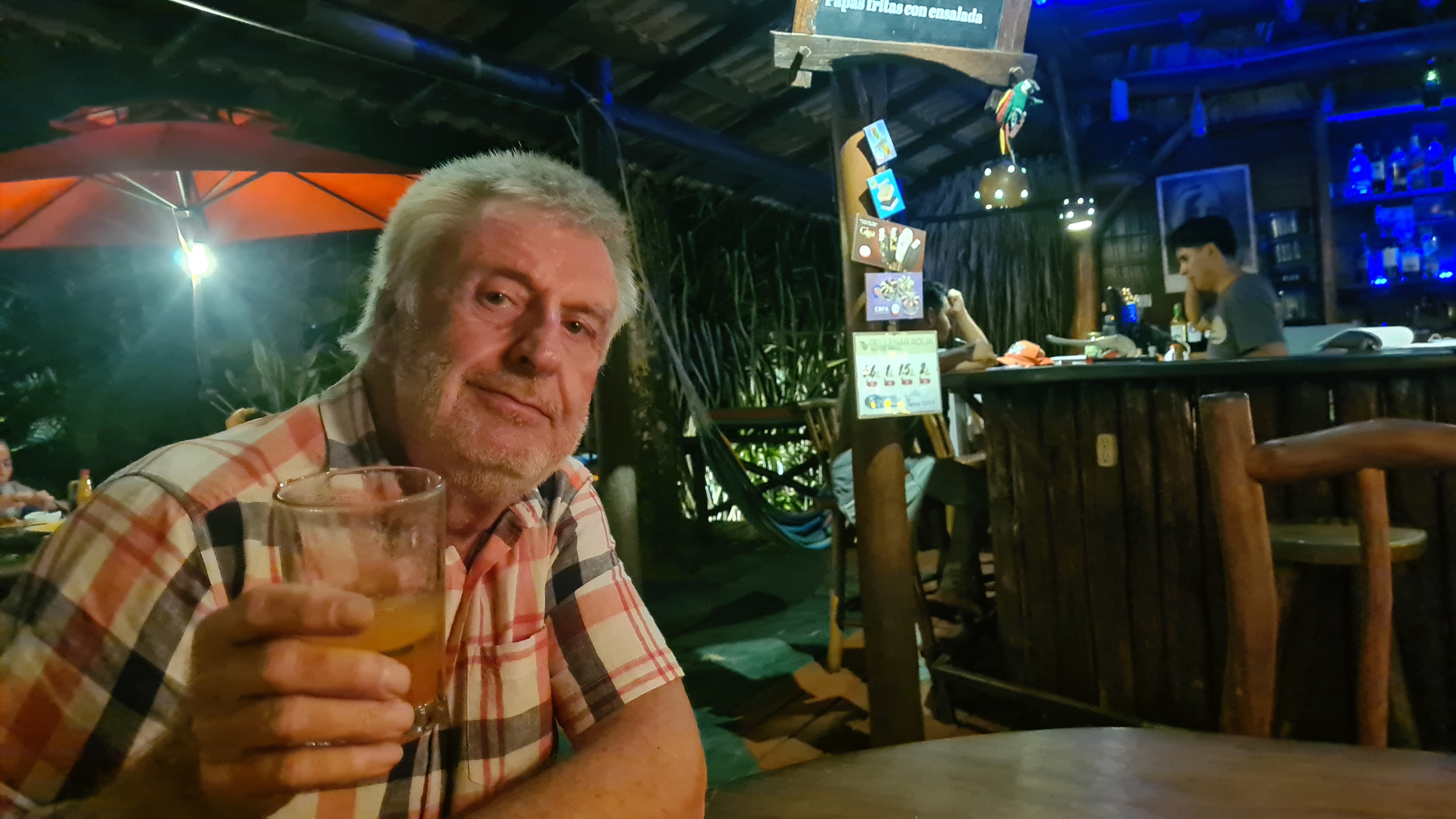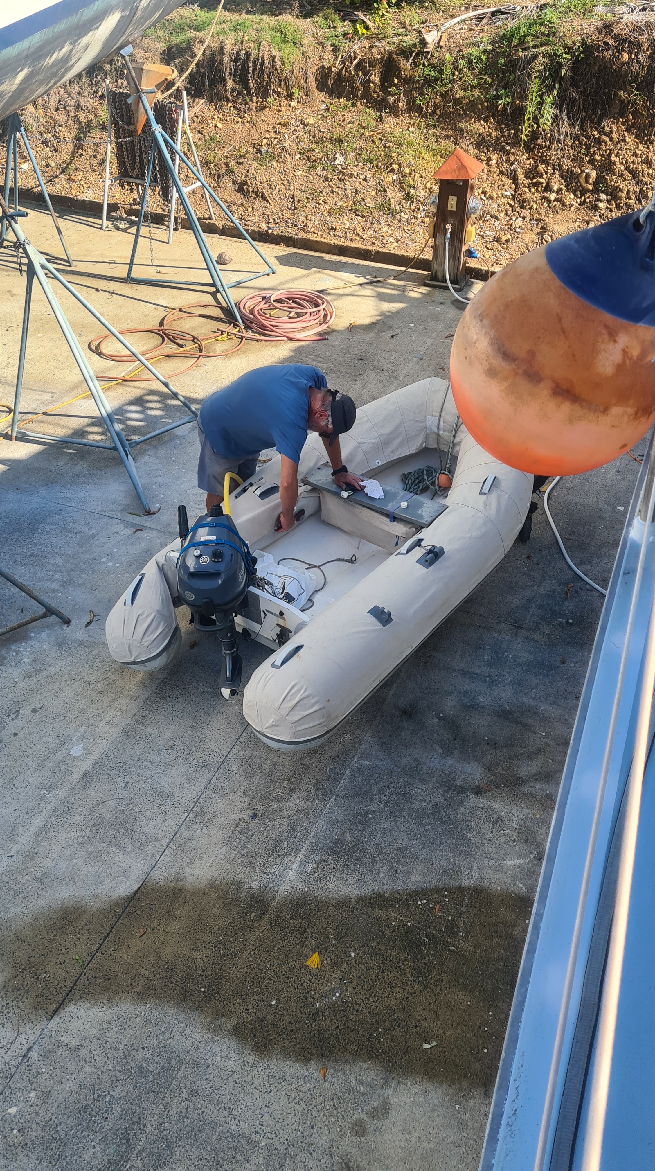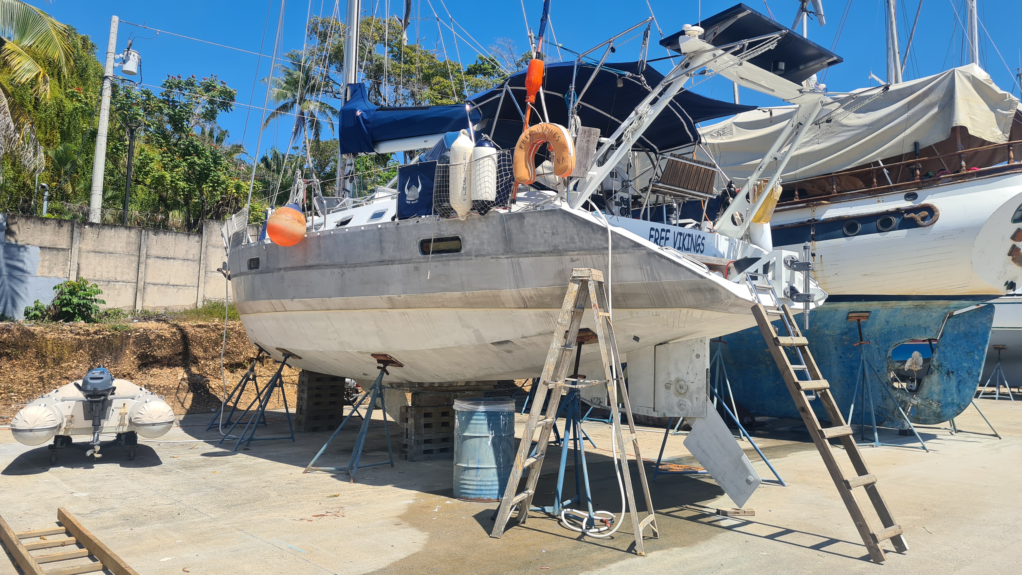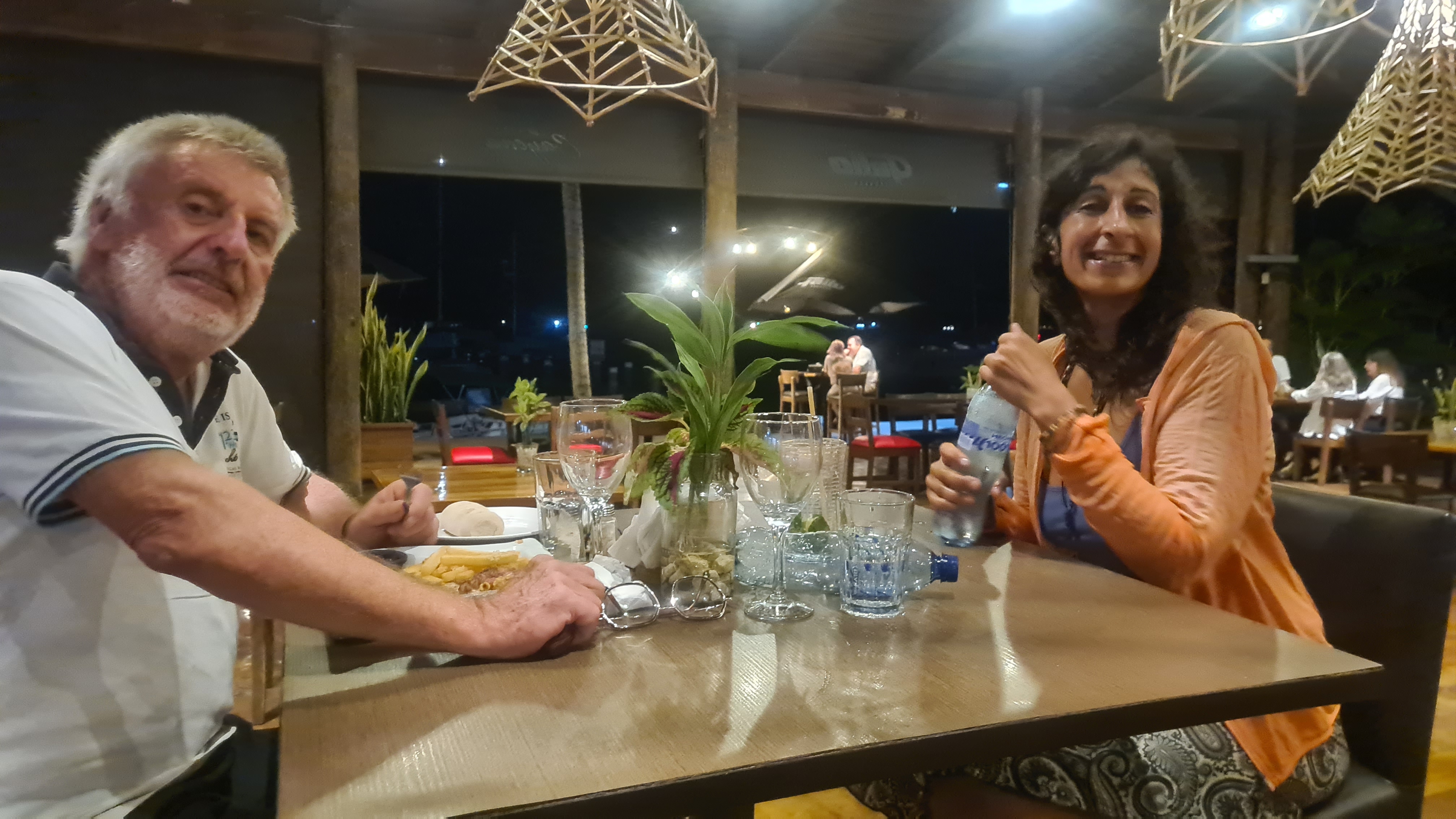 Nous retrouvons notre Free Vikings tout brillant, propre, fraichement repeint. Nous sommes agréablement surpris de trouver l’intérieur dépoussiéré, nos affaires et housses de coussins lessivées, soigneusement pliées. Ricardo, qui a pris soin de notre bateau pendant notre absence est une vraie perle ! Du coup nous ne dormons que trois nuits dans la chambre que nous avions réservée, persuadés que nous étions de trouver notre bateau très sale. Nous retrouvons avec bonheur nos couchettes confortables. Nous passons quatre jours à remettre en place tous les cordages, replacer les derniers équipements qui avaient été démontés, chercher une pièce du pilote automatique heureusement retrouvée au fond d’un coffre, réparer quelques incidents de vieillerie comme les axes de fermetures des hublots… Nos soirées et repas, pris au snack de la marina ou dans les restaurants du coin sont très sympathiques. Nous passons quelques bons moments avec Philippe et son équipier Guy, ou avec Edouard, sa femme Christine et son équipage. Nous prenons des lanchas pour aller diner dans de sympathiques restaurants enfoncés dans la jungle, accessibles par le Rio. Nous avions déjà rencontré Edouard en avril dernier lors de notre arrivée et sommes heureux de le retrouver ayant gardé un très bon souvenir. Ils vont suivre la même route que nous jusqu’en Bretagne à bord de leur beau voilier « Belle Aventure » et nous espérons bien nous retrouver en chemin.