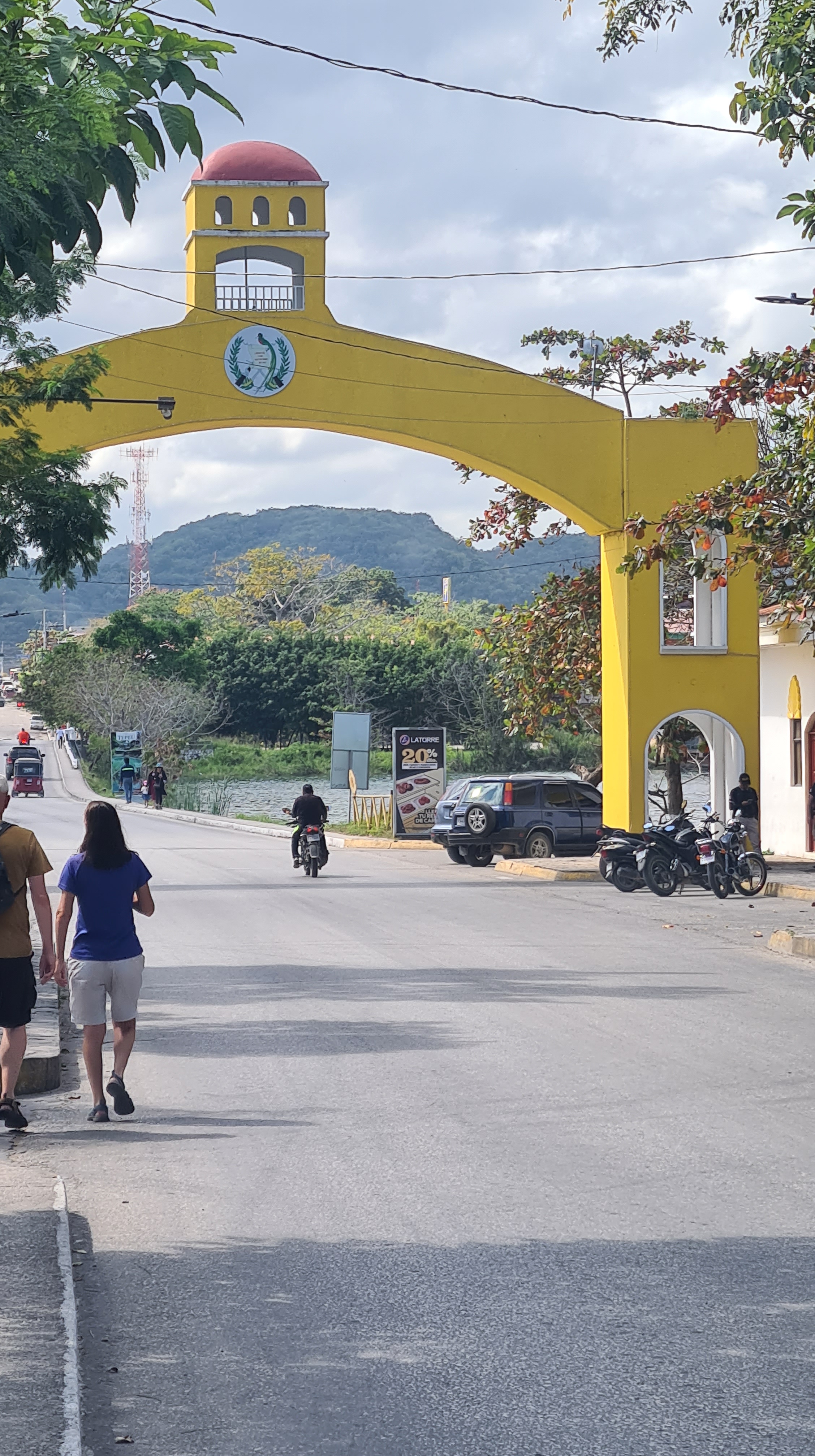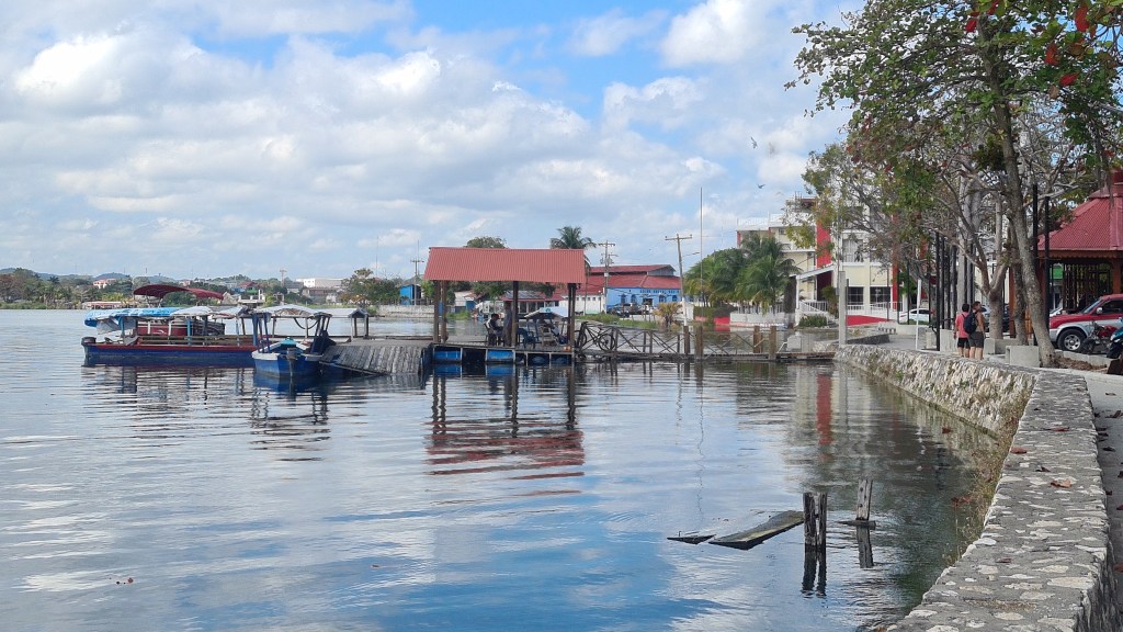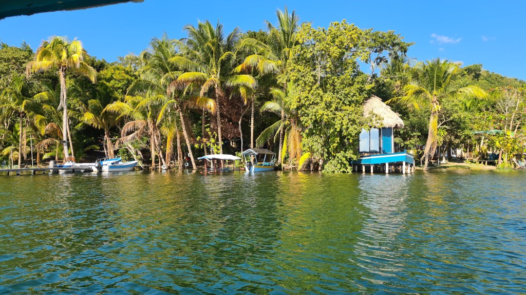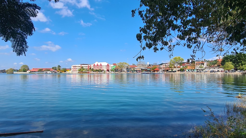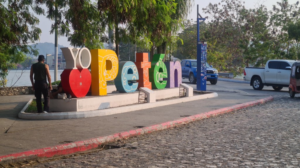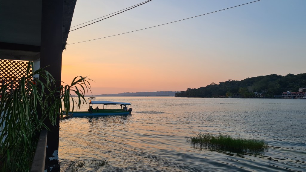 Et le 16 février nous partons dans la matinée avec notre sac sous le bras prendre un nouveau bus pour nous rendre dans le Nord du pays. Nous arrivons à Florès, 200 km plus loin au coucher du soleil avec deux heures de retard et après 5 heures de bus ; il faut rester cool d’autant plus que les paysages traversés sont magnifiques ! Florès est située dans le Petén, région privilégiée du Guatemala car riche en sites archéologiques et en parcs naturels protégés. Elle se trouve au bord du lac Petén Itza, et la vieille ville touristique dans laquelle nous logeons est une petite ile que nous rejoignons par un pont. L’entrée est gardée par des militaires. Ils ne sont jamais très loin au Guatemala.