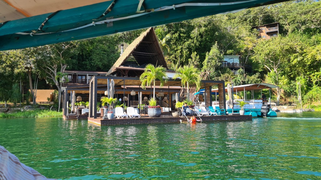 L’Isla de Florés n’est pas très grande, les rues pavées étroites tournent autour de l’île au centre de laquelle trône une belle église catholique. Les hôtels jouxtent les boutiques de souvenirs et les restaurants, tous avec une belle terrasse les pieds dans l’eau. Les pied parfois vraiment dans l’eau, car elle est haute de 3 mètres au-dessus de son niveau « normal ». Ce lac n’est relié à aucun cours d’eau avalant et donc ne se vide pas ; et si les pluies sont trop importantes en été, le niveau monte ! Les petites rues colorées et fleuries sont très agréables à parcourir et même s’il fait chaud (Eh oui les températures ont monté et sont revenues à la normale), on trouve vite une terrasse au bord de l’eau avec un coulis d’air. La terrasse de notre hôtel est également bien agréable et nous y passons de bons moments.