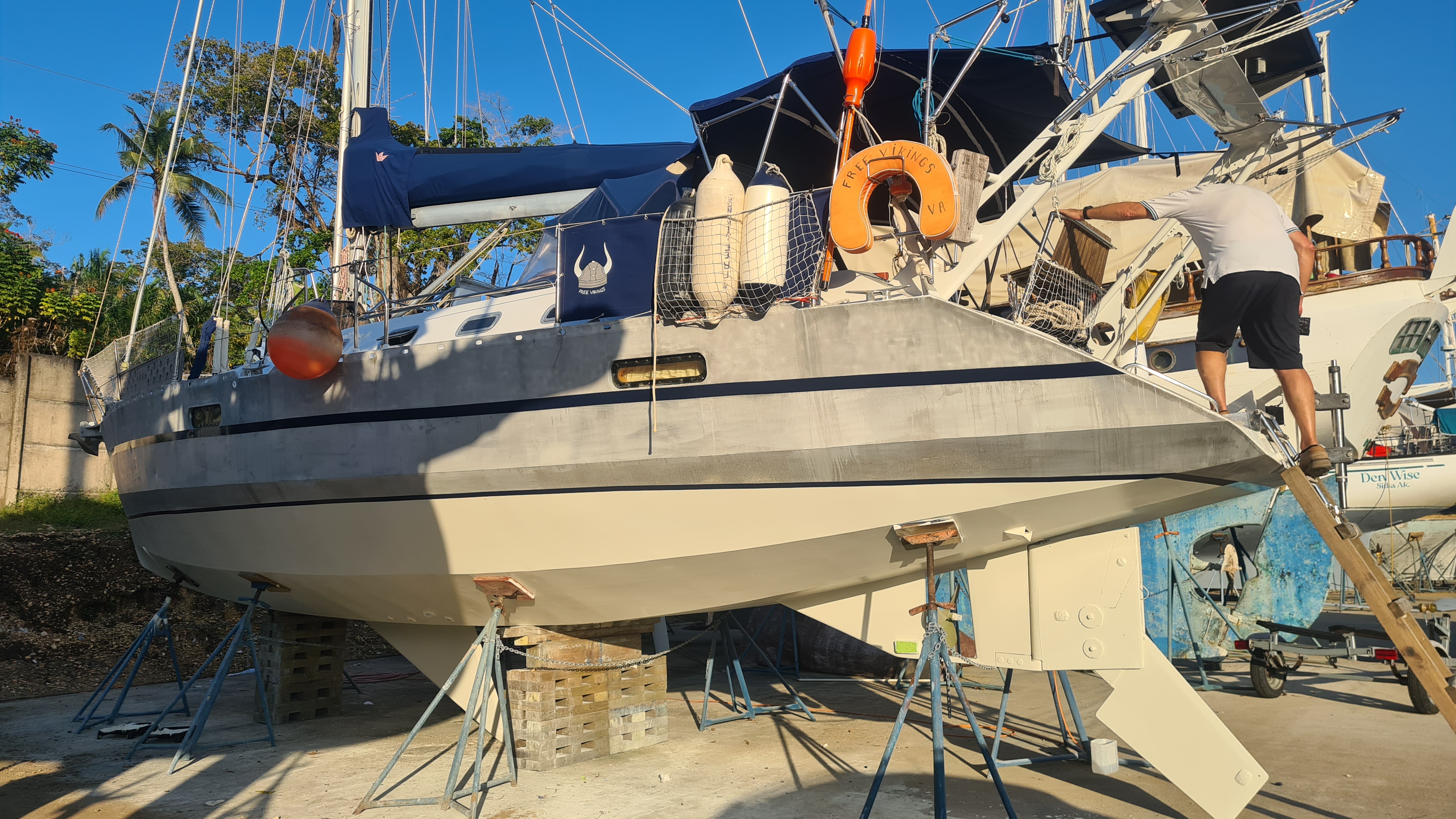 Nous en finissons avec plaisir avec les trajets en bus et retrouvons Free Vikings à Rio Dulce le 19 février. Nos copains sont partis, nous finissons les préparatifs sont un soleil de plomb, il fait 40° l’après-midi sur le tarmac en ciment sur lequel est posé le bateau. Free Vikings a droit à deux couches d’antifouling, une bande déco sur sa coque toute neuve et sera remis à l’eau le 23 février. Nous faisons encore une belle rencontre en la personne de Donia, une baroudeuse d‘origine bretonne, qui passe son temps à voyager et ne pose son sac que pour travailler un peu pour mieux repartir. Le séjour sur le Rio Dulce est plutôt agréable. Le fleuve permet d’accéder aux restaurants, aux magasins, la ville se trouvant sur la rive opposée à la marina. Dès que nous gonflons l’annexe les choses sont bien simplifiée, un petit canal accède directement au supermarché et nous permet de faire un avitaillement complet.