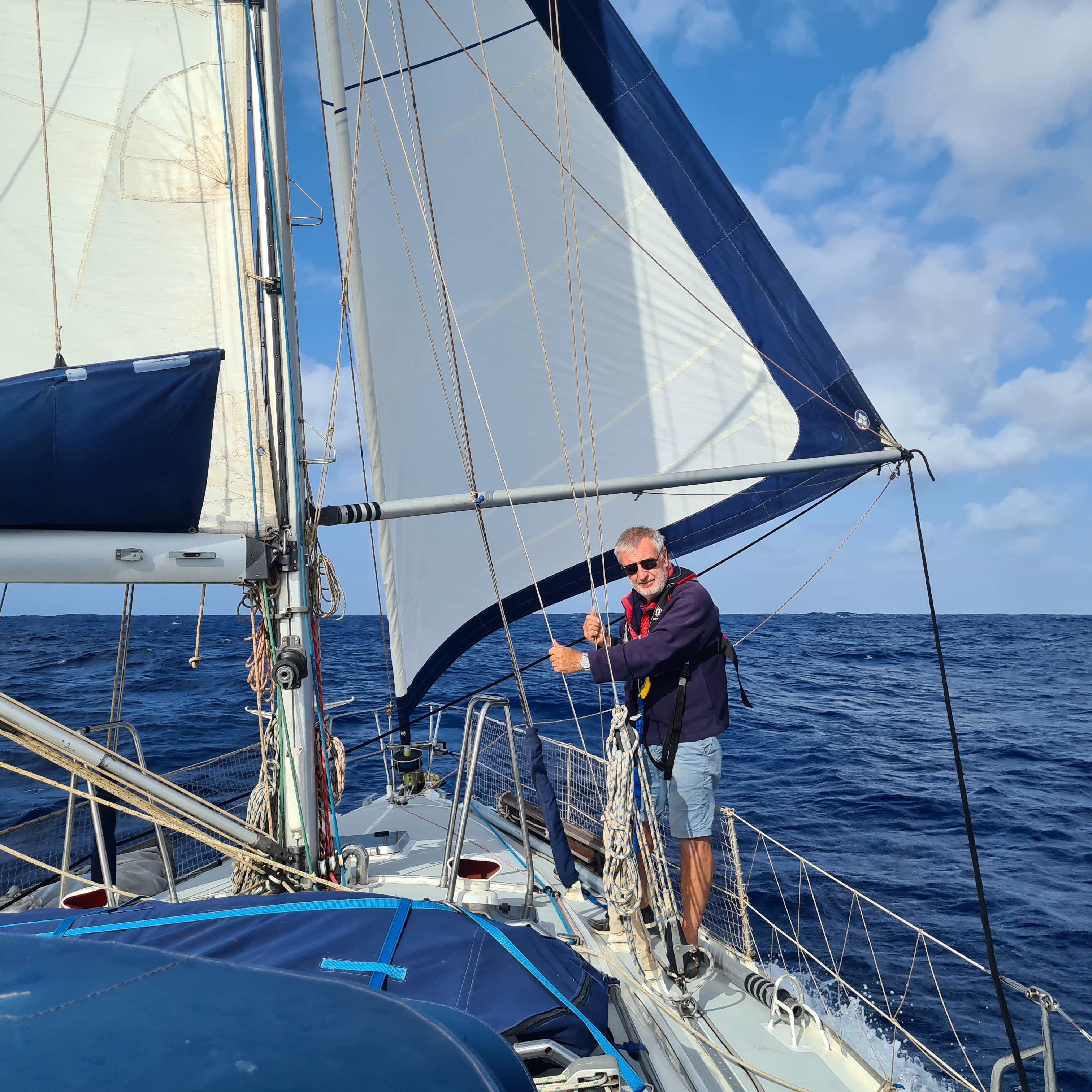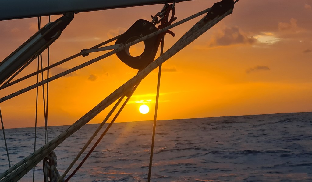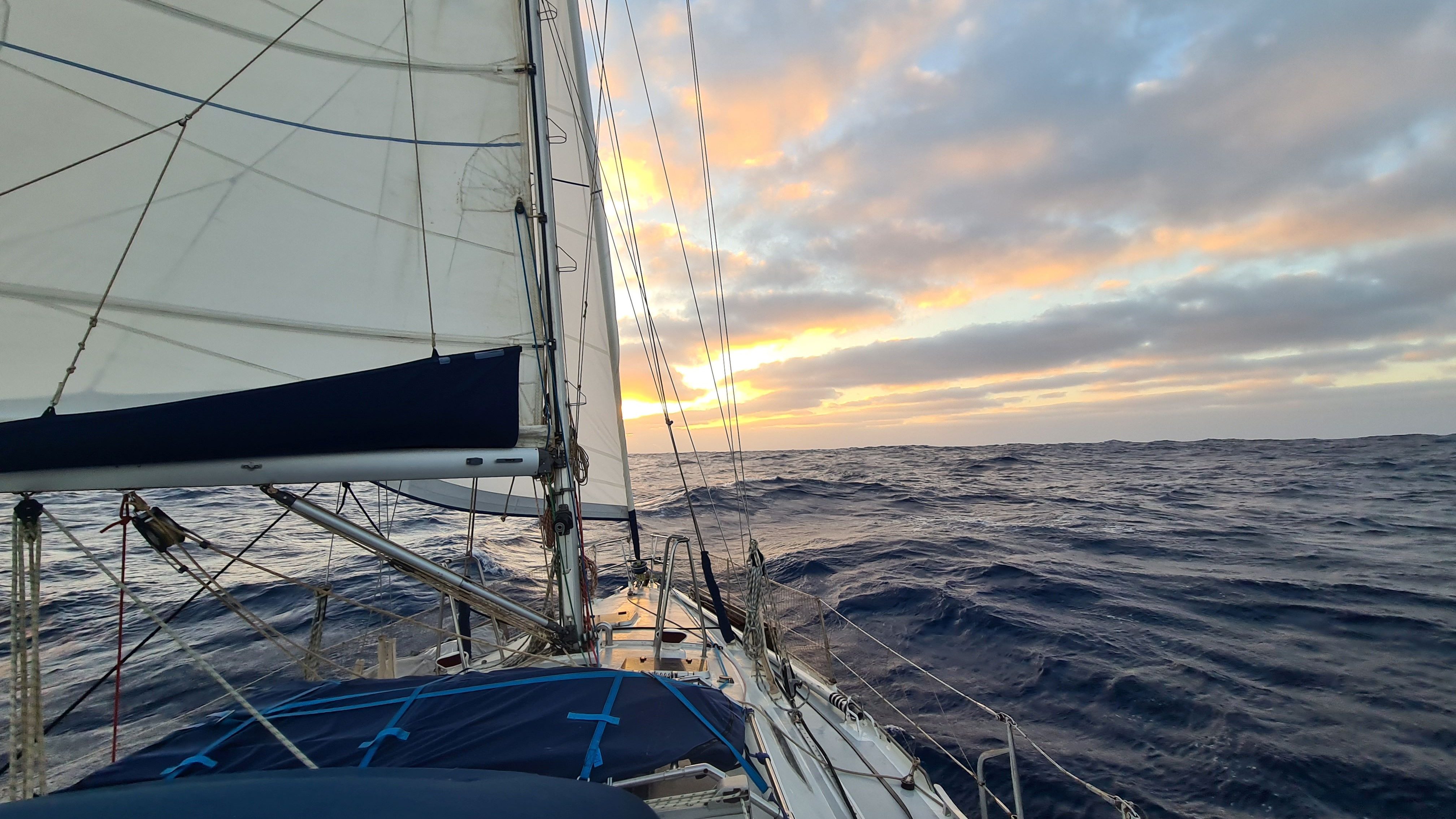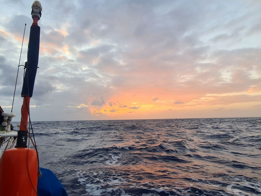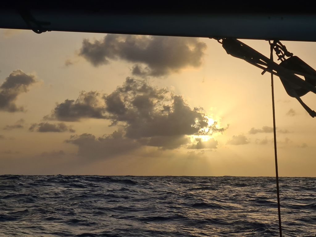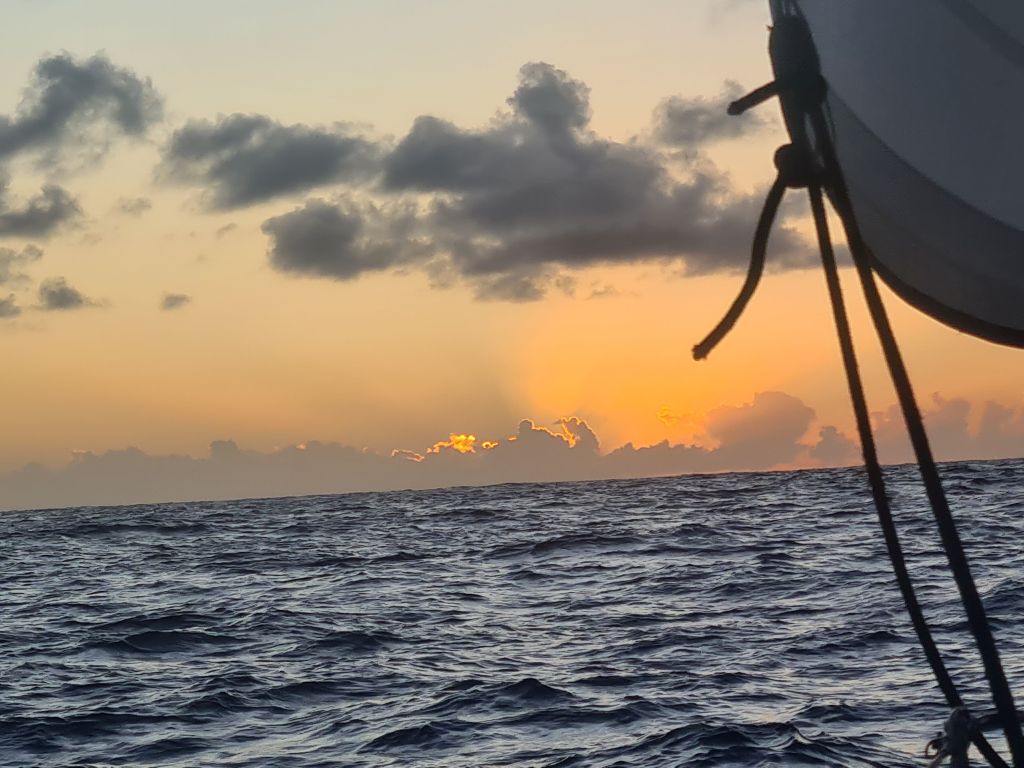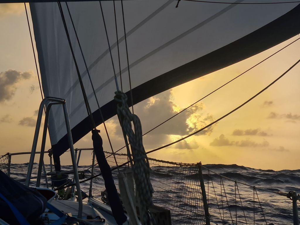 Nous trouvons bientôt l’allure qui va nous accompagner 5 jours durant, grand largue, un ris, le génois pas mal enroulé pour un vent de Nord-Est avec des rafales à 25 nœuds, la mer est assez agitée et nous roule dans tous les sens. Les premiers jours ne sont pas très ensoleillés car l’harmattan toujours présent voile pas mal le soleil. Il faudra d’ailleurs attendre le milieu de la traversé pour avoir enfin un horizon clair, et espérer admirer de beaux couchers ou levers de soleil. Nous manœuvrons peu, le vent restant très soutenu, avec une accalmie qui nous permet de relâcher le ris, vite repris car les rafales reviennent de plus belle. Nous avançons bien à ce train et parcourons plus de 150 milles par jours.