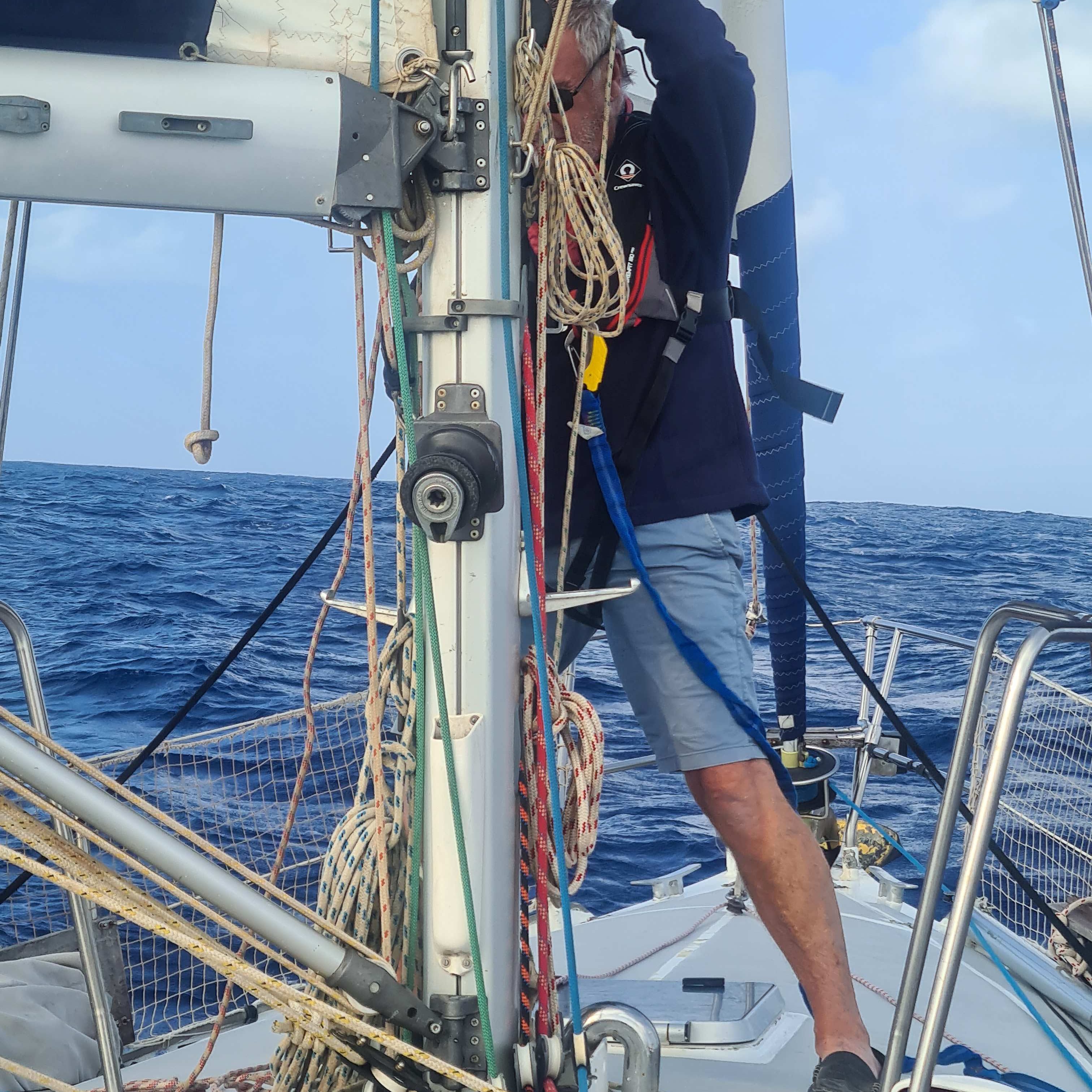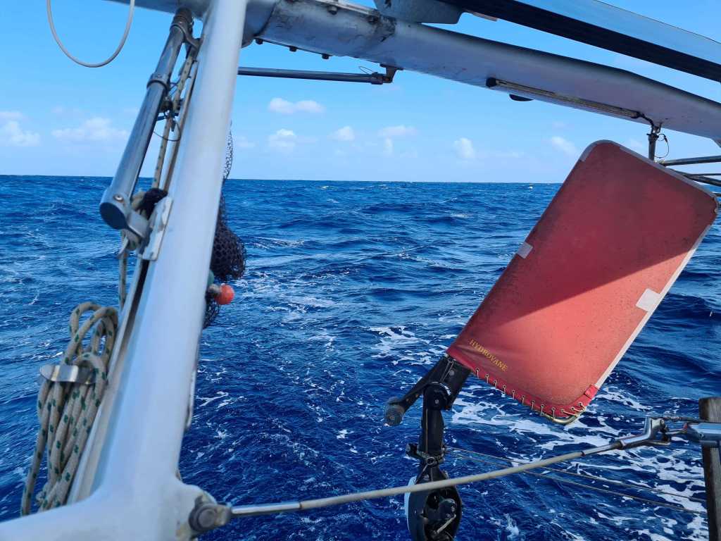Les derniers jours nous manœuvrons un peu plus pour continuer à avancer, en empannant tantôt le génois, tantôt la grand-voile. Lors d’une de ces manœuvres la poulie du rail de tangon en plastique, vieille de plus de 20 ans, explose. Elle nous permettait de ranger le tangon le long du mat facilitant sa manipulation. Ce n’est pas bien grave mais cela ne facilite pas les choses à Philippe.