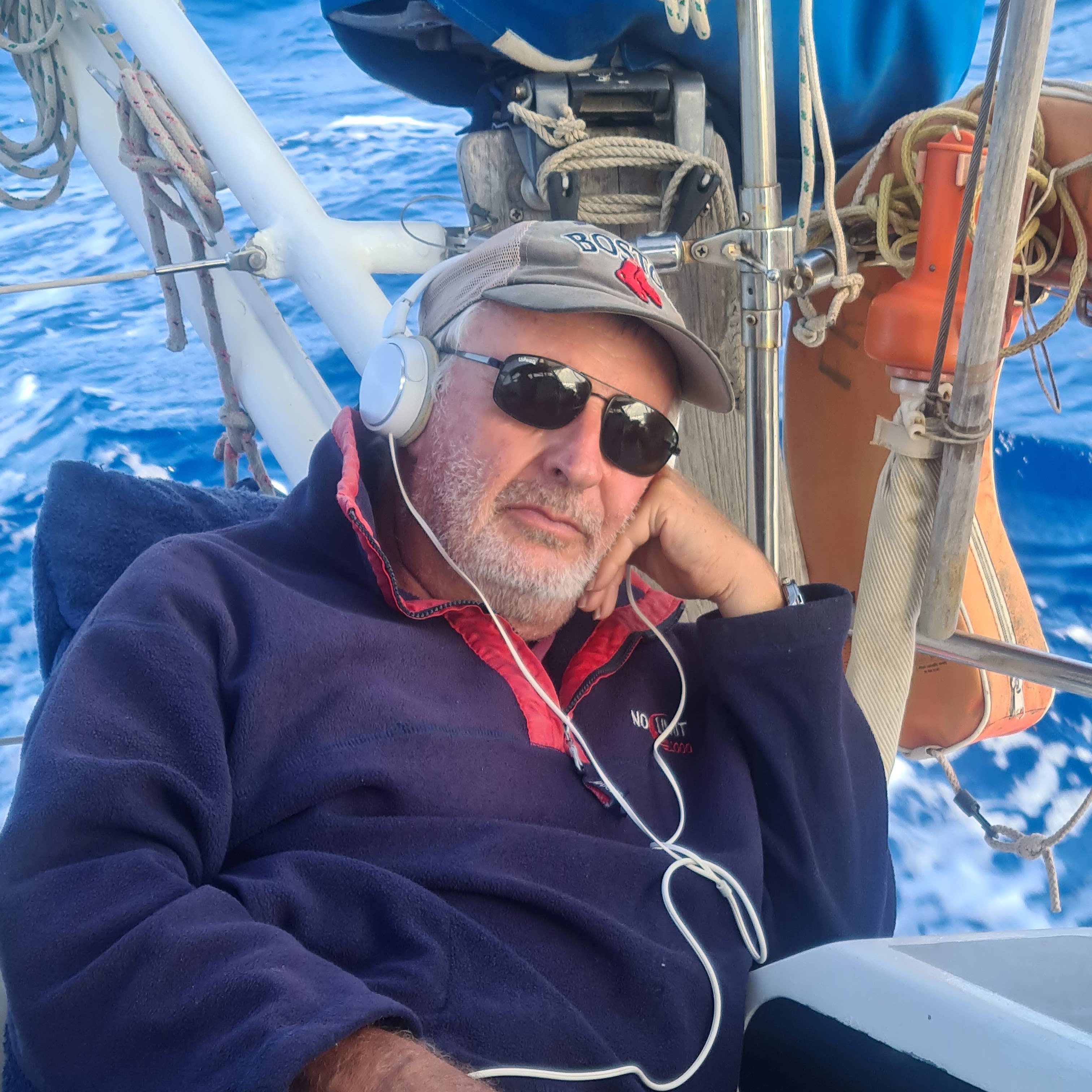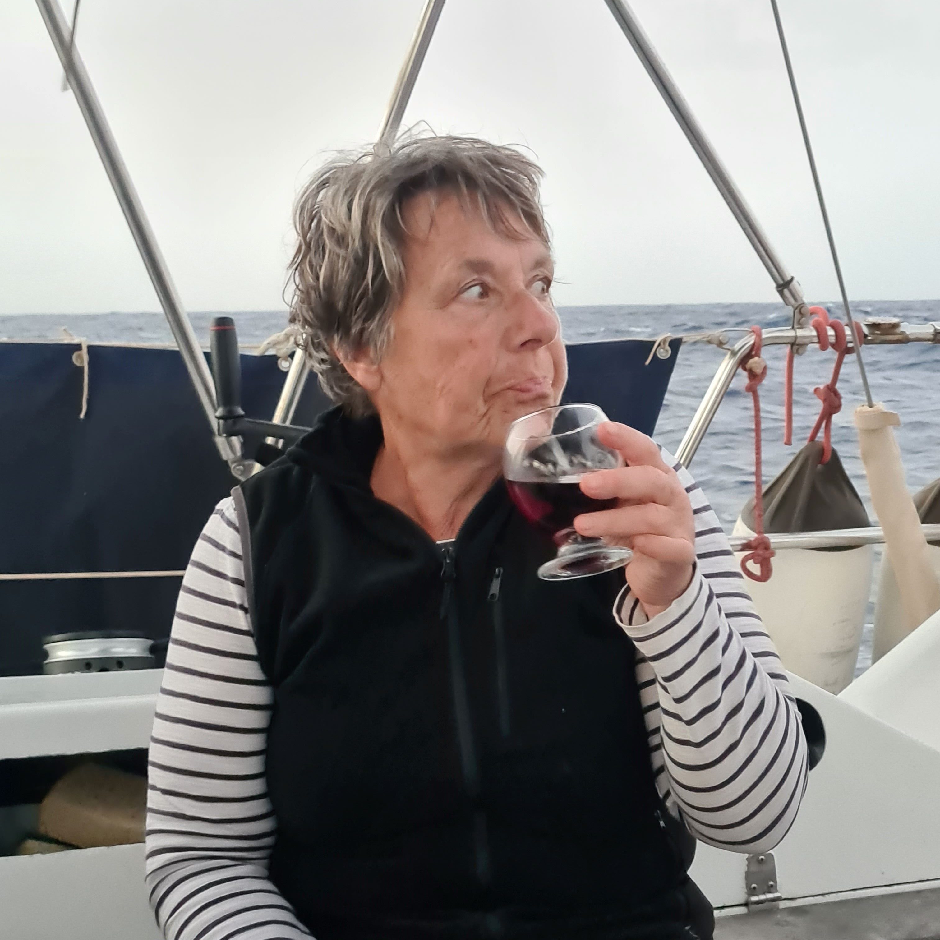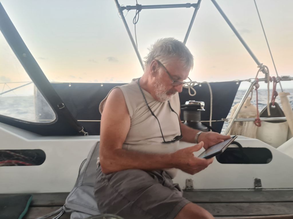 Nous reprenons un rythme déjà éprouvé des quarts de 3 heures la nuit, chacun deux ; je fais la cuisine, Philippe la vaisselle ; la question fondamentale du jour étant : « Qu’est-ce qu’on mange ? ». La matinée passe assez vite, entre le petit déjeuner qui s’éternise, la petite sieste du premier réveillé, la toilette dans la jupe avec l’horizon pour spectacle, et la communication par satellite. Les après-midis sont plus longues, lecture, mots-croisés, lecture, une petite sieste, une partie de scrabble, un peu de musique…