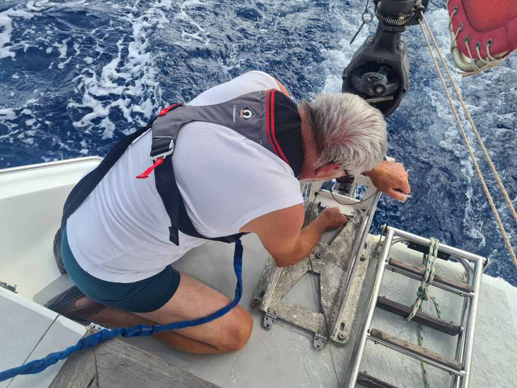 Le cinquième jour le vent tourne à l’Est, nous installons le tangon sur tribord et la grand-voile sur babord et continuons à avancer à vive allure en prenant parfois un ris et en enroulant plus ou moins le génois pour que le bateau reste bien manœuvrant pour notre fidèle régulateur d’allure Vany. Celui-ci est tout content d’avoir été soigneusement graissé ce qui a bien amélioré ses performances. Il prend un peu de liberté au bout de 10 jours de travail et a besoin d’un petit tour de vis. En clair les fixations et divers boulonnages ayant pris du jeu, il commence à vibrer très bruyamment et Philippe doit (bien attaché) aller dans la jupe pour resserrer un peu tout cela. Notre course folle au travers de l’Atlantique se poursuit à son rythme effréné pendant encore 6 jours. A partir du douzième jour le vent faiblit et oscille entre l’Est-Sud-Est et l’Est-Nord-Est, mais malheureusement cela ne devient pas plus confortable pour autant, car la mer reste plutôt agitée.