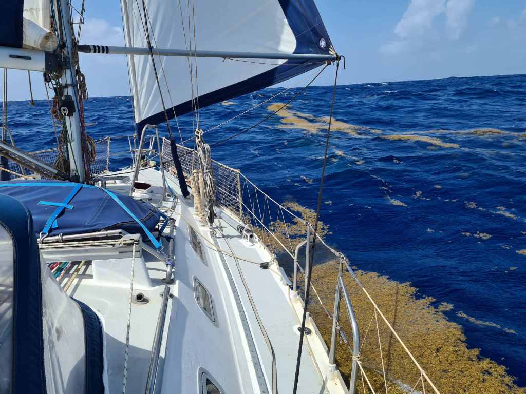 Mais qu’en est-il du moral de l’équipage ? Le vent soutenu, la vitesse élevée du bateau génèrent en plus des vagues qui nous ballottent, des claquements, des craquements, des coups de gite. Il faut bien s’adapter aux conditions très inconfortable. Nous retrouvons d’ailleurs le même schéma que lors de notre première transat en 2017. J’ai quand même l’impression que la mer avait fini par se calmer un peu plus tôt ou bien je le supporte plus difficilement ? Il est difficile pour moi de trouver le sommeil certaines nuits et la fatigue s’accumulant, certaines journées sont très brumeuses. Heureusement nous n’avons pas beaucoup à manœuvrer le bateau marchant tout seul barré par Vany ; quelques réglages de l’angle de barre ou de l’aérien seulement par moments. Nous nous sentons bien seuls car nous ne voyons absolument aucun bateau, ni même sur l’AIS pendant au moins 12 jours. Les sargasses présentent dans l’eau tout le long et quelques oiseux visiteurs pour seules compagnies !
