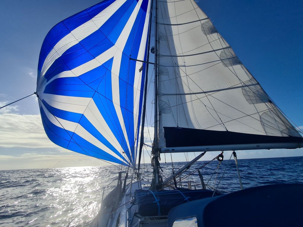 Peu avant cet incident, je me disais que nous avions de la chance de ne pas avoir eu de problème technique lors de cette traversée. Pour me faire mentir un peu plus, le vit mulet (attache de la bôme sur le mat) casse à nouveau, trop sollicité par le vent instable. Ce point faible du gréement nous enquiquine régulièrement. Nous affalons donc et ficelons la grand-voile pour ne rien casser d’autre et terminons les quelques 24 heures de fin de transat, soit sous génois, soit sous gennaker, soit un peu au moteur lorsque les conditions deviennent trop instables à la voile faute de vent.