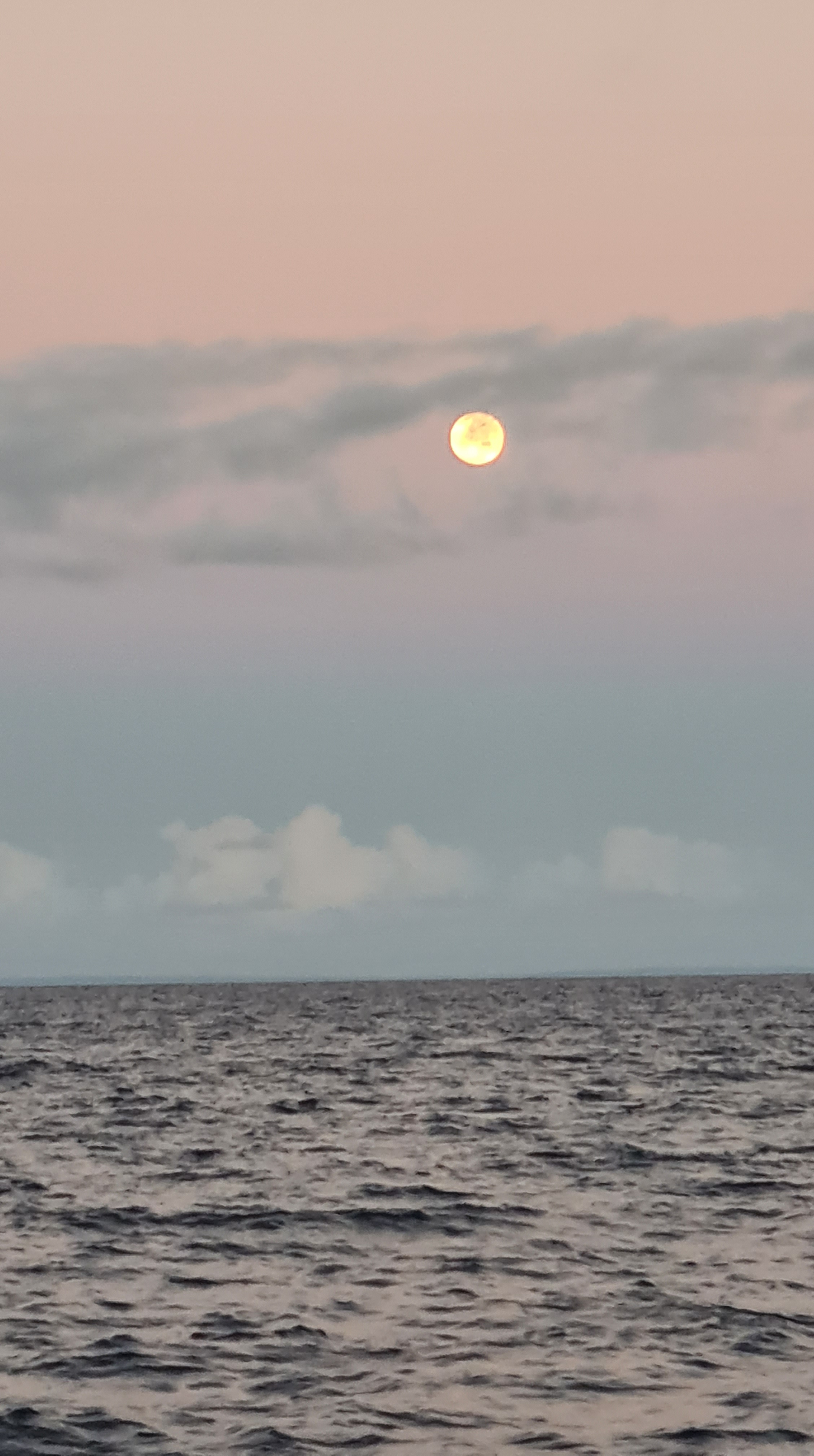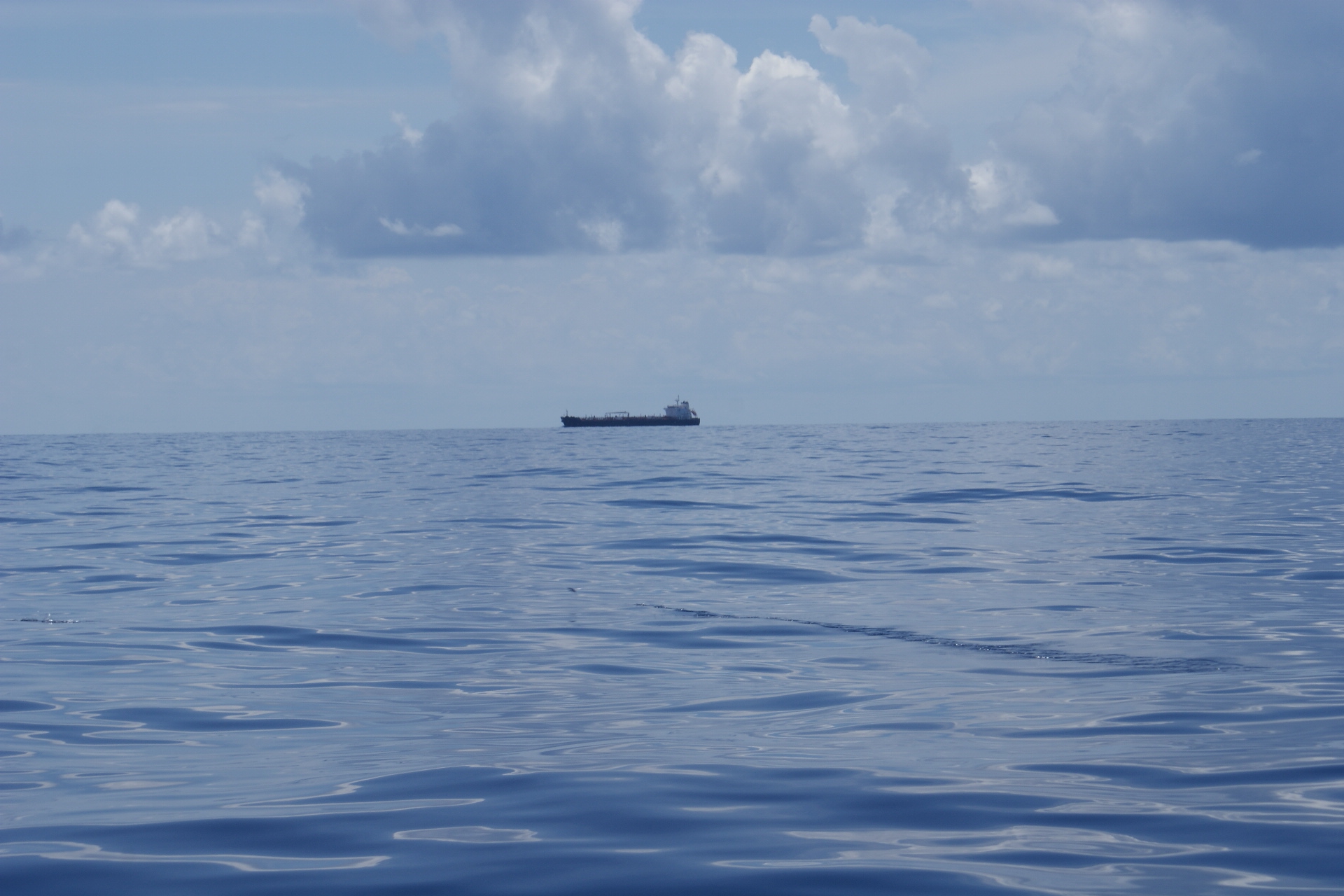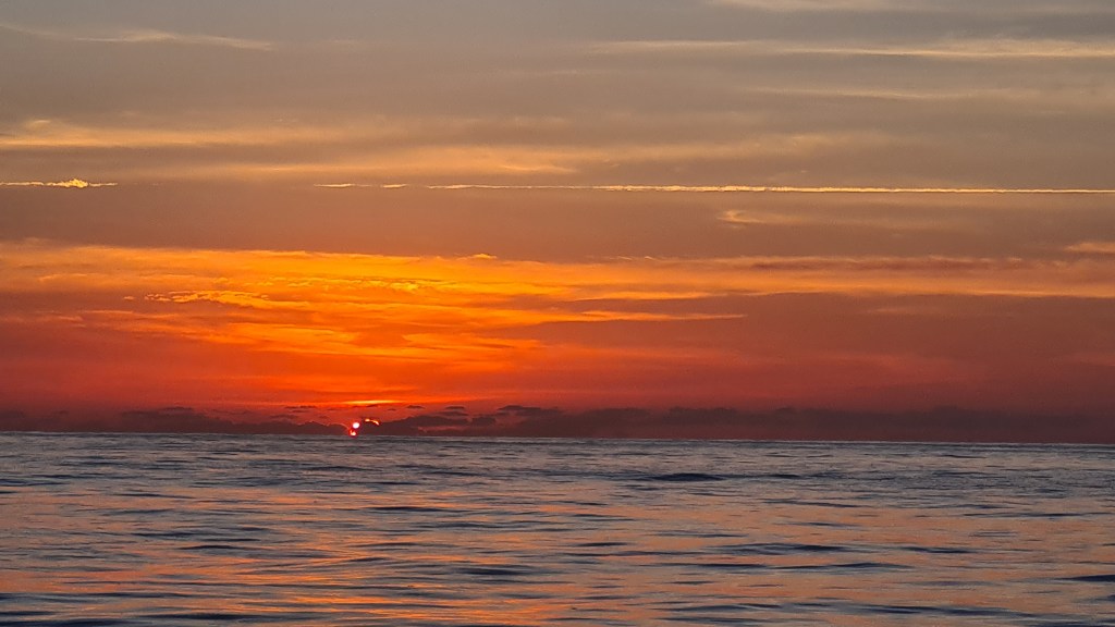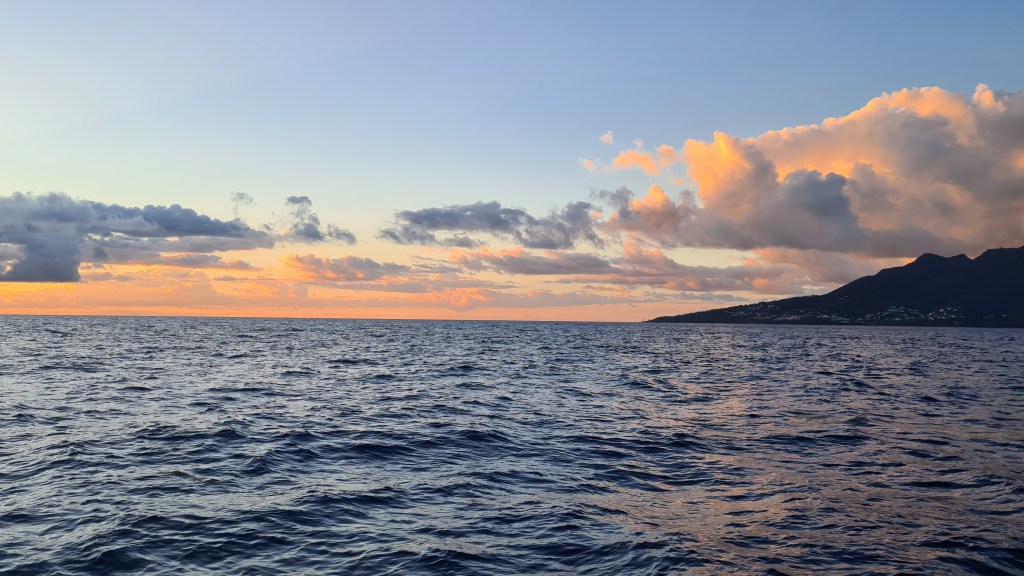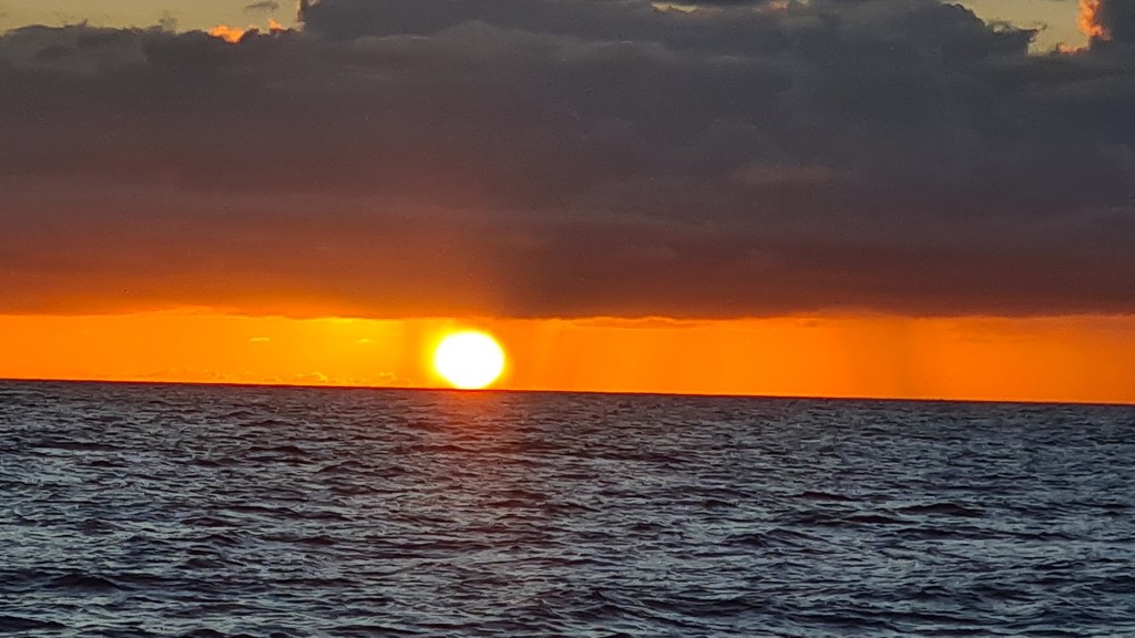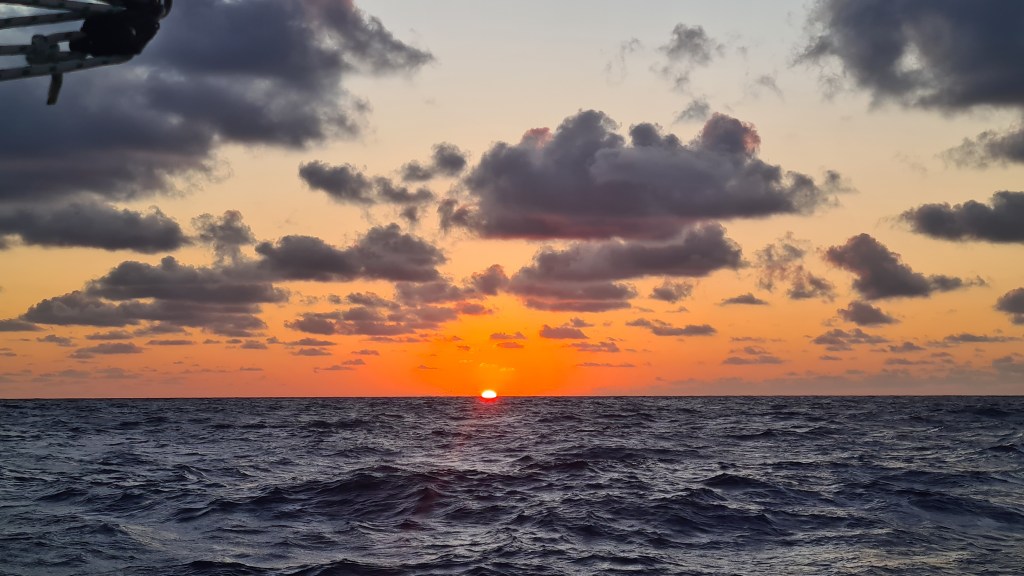 C’est le désert total autour de nous, nous croisons quelques tankers et cargos de loin, mais moins d’un par jour. Des globicéphales viennent tourner autour du bateau, mais leurs apparitions sont si éphémères que nous n’avons pas réussi à les prendre en photo. Nous apercevons quelques oiseaux : des paille-en-queue et des fous de Bassan. Les journées et les nuits sont bien monotones mais se suivent inexorablement. La lune éclaire nos nuits, et les levers et couchers de soleil nous émerveillent. Nous avons même pu observer un ou deux rayons verts.