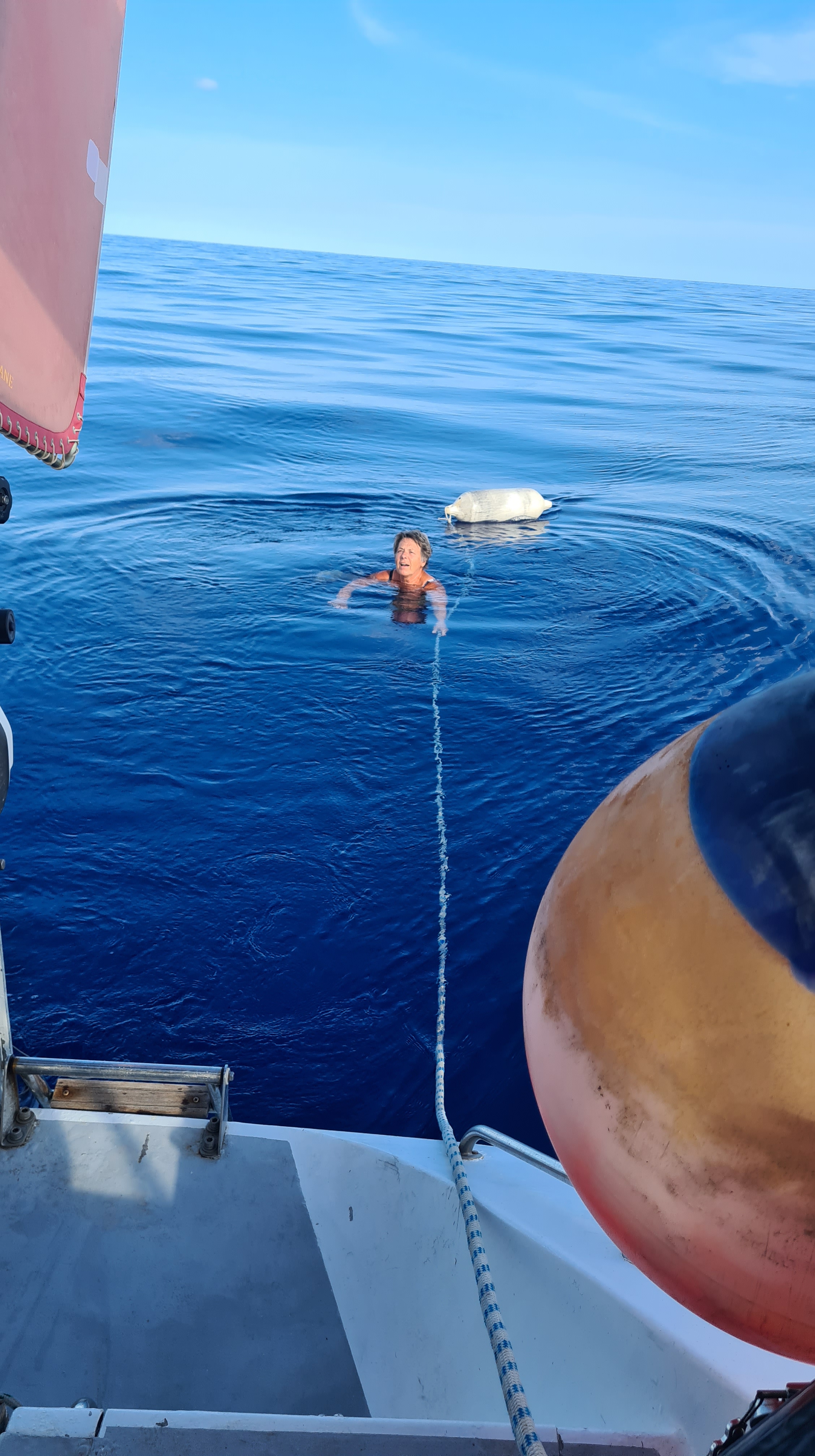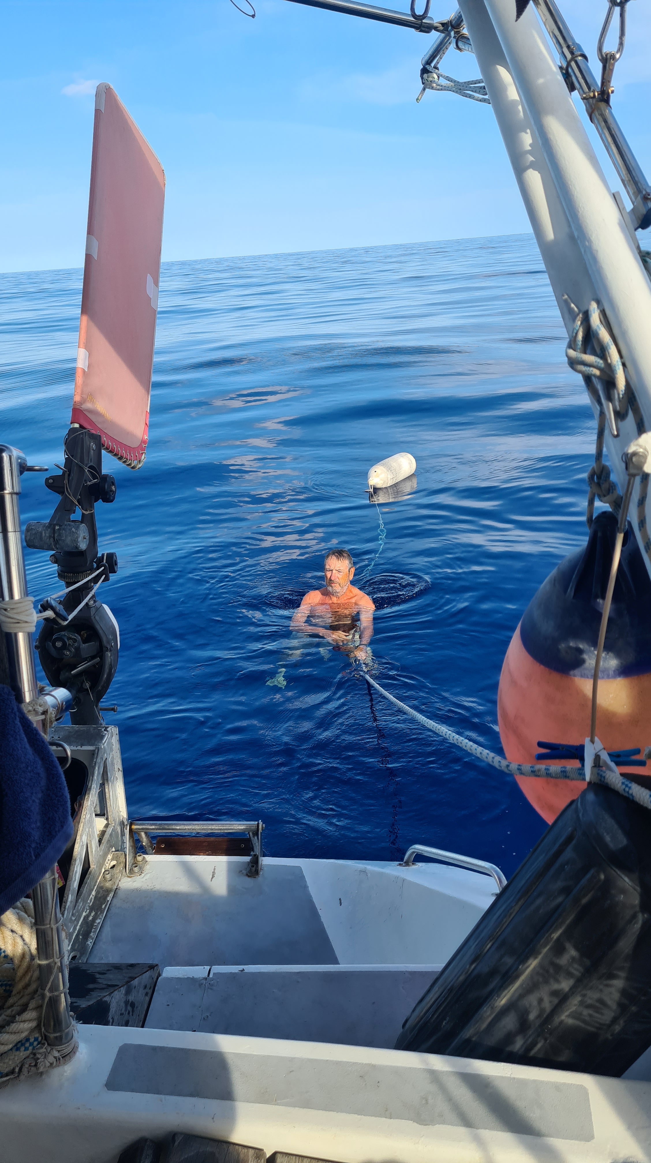 Nous passons les trois premiers jours à ce cap en alternant les périodes sous voile où nous arrivons à avancer un peu, aidés par un courant bienvenu, et quelques périodes de moteur quand les voiles se mettent à battre dans tous les sens, nous agaçant encore plus que le moteur ! Nous arrivons à naviguer plus de 24 h à la voile sans faire des moyennes extraordinaires malgré le gennaker, pour retomber dans une zone de calme où nous nous retrouvons dans les conditions de premiers jours et même pire. En effet la journée du 18 mars c’est la pétole totale, il fait même très chaud en pleine mer, nous arrêtons le bateau et nous baignons. Cet exercice est extrêmement rare, il faut vraiment que vent soit nul et que le bateau n’ait aucune erre pour faire ce genre de chose sans danger.
