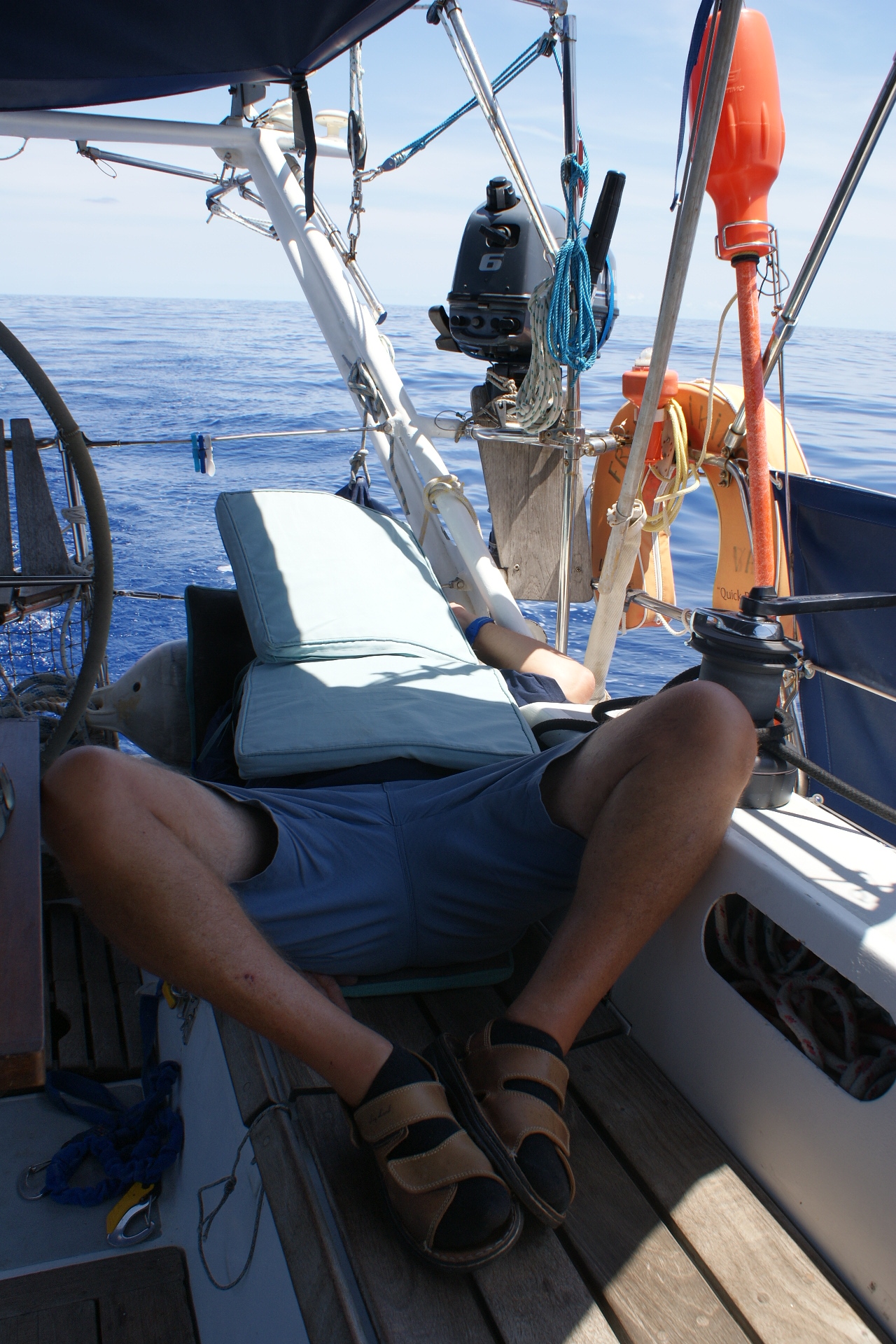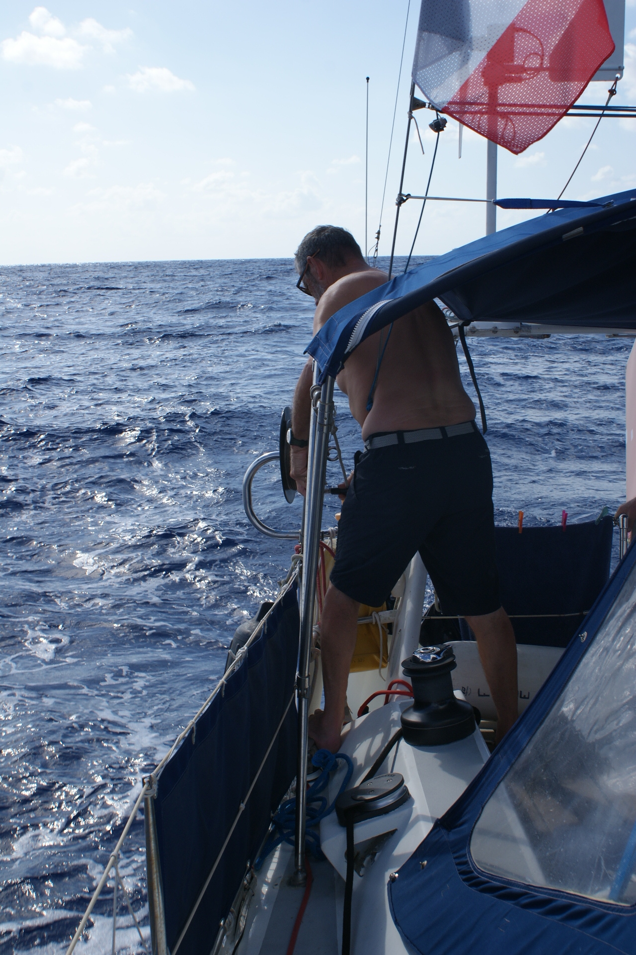 La vie s’organise à bord. Comme vous pouvez l’imaginer avec ces conditions bien molles, il n’y a pas grand-chose à faire en dehors de manger et de lire. Le 15 mars, nous fêtons l’anniversaire de Philipe en nous offrant un apéro un peu plus complet que d’habitude, et en dégustant un baba au Rhum. Daniel aimerait bien pêcher mais la drague-queen qu’il a mise en appât n’inspire pas les poissons et c’est vraiment lassant de passer son temp à démêler les sargasses de la ligne.