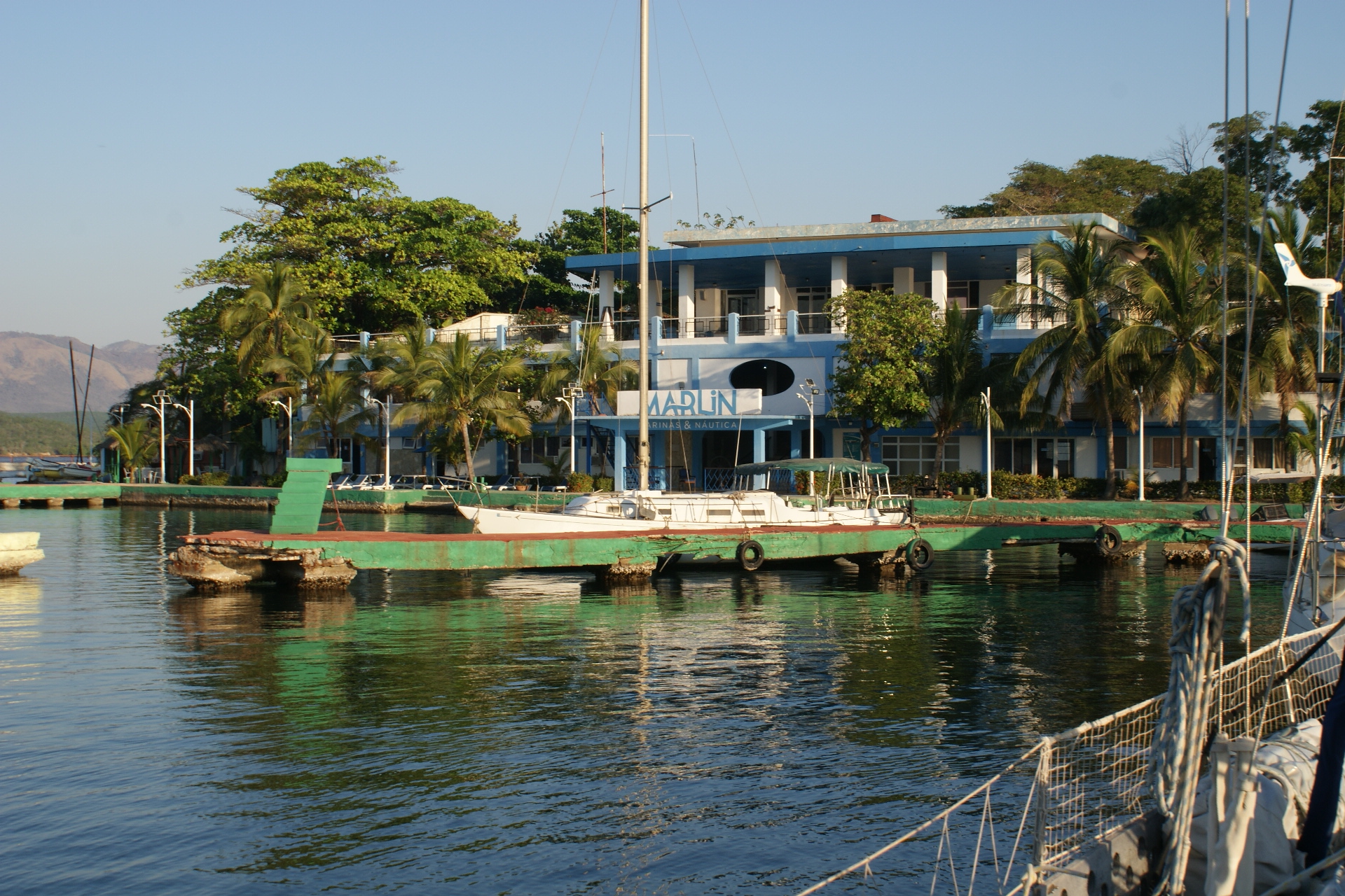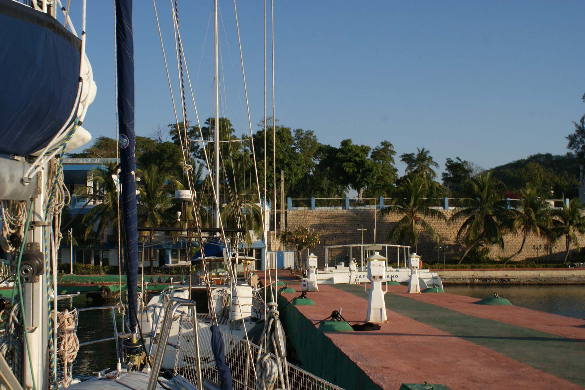 Après un appel à la VHF nous sommes accueillis par un marineros de la Marina Marlin de Santiago et l’officier d’immigration au bout d’un des quais délabrés. Celui-ci, très affable, nous invite à le rejoindre dans son bureau où il nous enregistre, photos, prise d’empreintes, etc.. Ça s’est bien modernisé en 6 ans. Il nous dit, ensuite, d’attendre le médecin à bord. Ce dernier arrive environs 45 minutes plus tard et là nous voyons que la modernisation n’est pas arrivée dans tous les services. Il remplit méticuleusement ses imprimés, recommence car il a fait une erreur « tranquille !» – Prononcer à l’espagnole, expression courante ici. Il nous demande à visiter le bateau, la pharmacie et inspecte les conserves et, au passage, nous chourave une boite de confits de canard, de pâté Hennaf et une boite d’antibiotiques soi-disant hors la loi, car elle est un peu périmée. Il demande la permission de les emmener, mais comment refuser !! Nous devrons ensuite retourner dans son bureau remplir encore plusieurs imprimés où il s’excuse de ses larcins en nous expliquant que la vie est de plus en plus rude. Nous rencontrons ensuite la muchacha qui gère la marina qui nous fait nous acquitter des nuitées au mouillage et des droits administratifs et, nous délivre nos visas, que nous devons faire tamponner par l’officier d’immigration. Tout se déroule dans divers bureaux de la marina, dans la bonne humeur, sans précipitation, c’est le moins qu’on puisse dire !