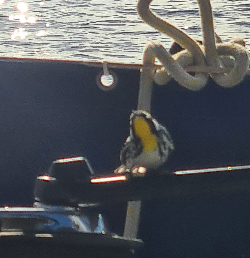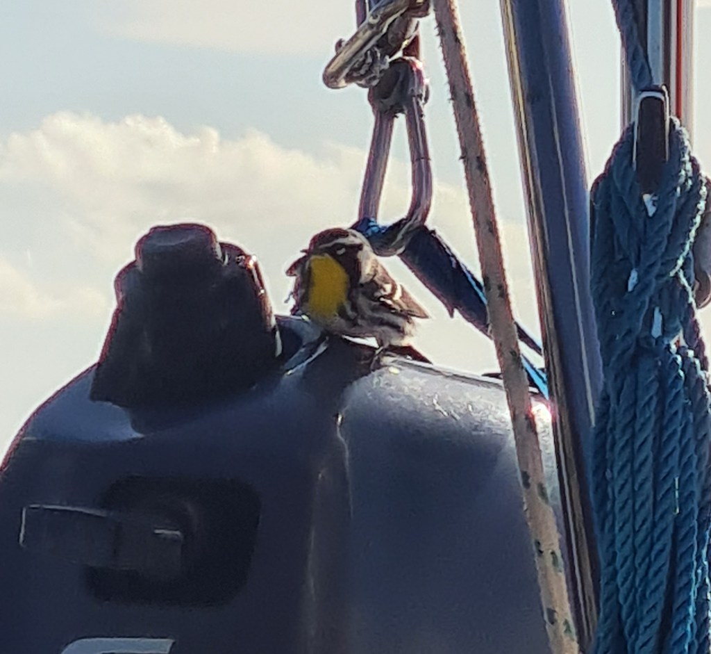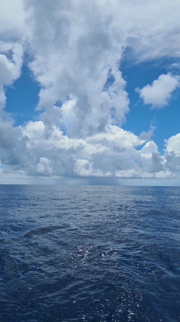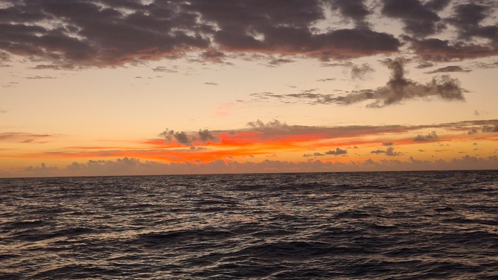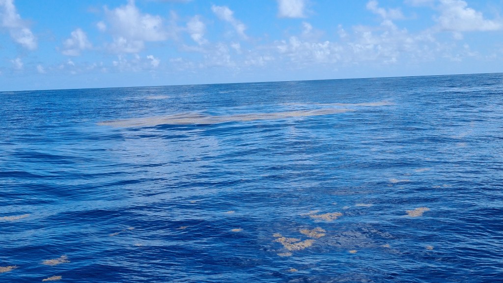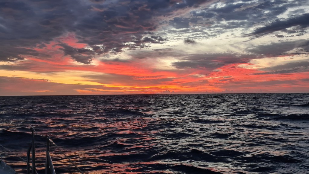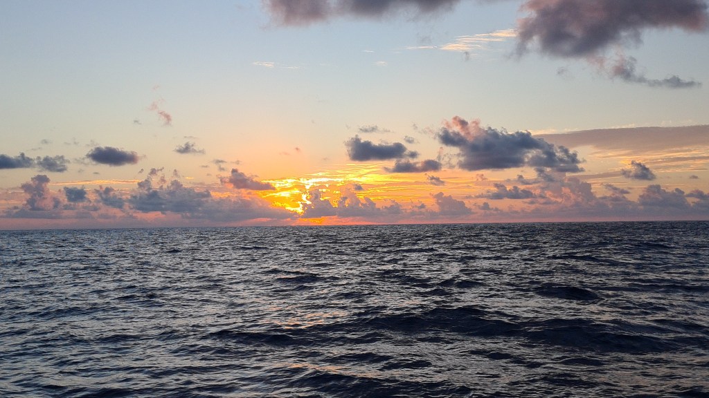 Nous terminons le 16 au matin par un beau bord vent de travers avec un vent qui fraîchit un peu pour le bonheur de l’équipage. Les soirs, des orages se développent sur la terre et nous assistons de loin à de beaux spectacles sur les côtes du Mexique. La dernière nuit c’est à notre tour d’en prendre un sur la tête. C’est un moment toujours un peu angoissant : ça pète de partout, il pleut très fort, on ne voit plus rien autour de nous. Nous sommes obligés de faire confiance à l’AIS (système de signalisation par VHF des navires) pour localiser les bateaux et évaluer leur route car le coin est pas mal fréquenté par des tankers, des navires de croisière et autres cargos. Heureusement cet orage n’a pas fait trop se lever le vent. Nous profitons bien de ces jours au large malgré les conditions, en admirant de magnifiques levers de soleil. De grands bancs de sargasses nous obligent à dégager le safran et le régulateur en embrayant le moteur en marche arrière. Nous avons un petit passager clandestin un moment…