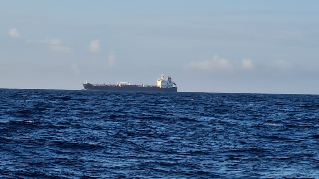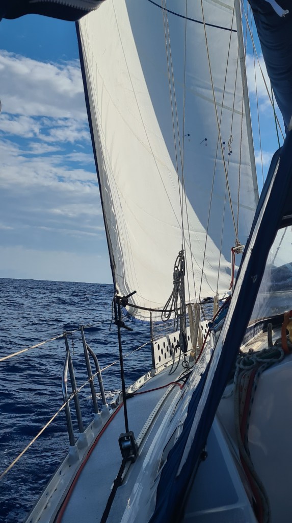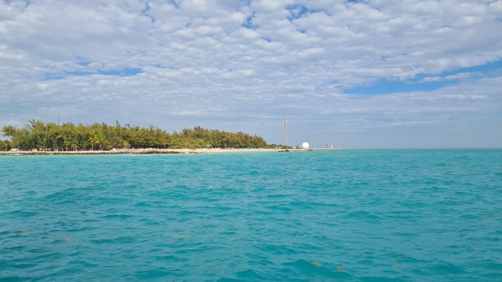 Le 12 mars une bonne brise d’Est souffle sur le Sud de la presqu’ile du Yucatan. Nous devons parcourir les 17 milles qui nous permettent de sortir de la barrière de corail en sinuant au moteur dans le chenal principal. Une fois sortis, nous pouvons envoyer le génois pour un beau bord de près qui nous amène, au milieu de la nuit, au Sud du Mexique face à une Caye que nous devons contourner ; et comme le vent est tombé nous repartons au moteur. Nous pensions trouver du courant portant : le Gulf Stream, mais nous le cherchons encore. Il y a bien eu à un moment de la traversée un petit nœud de courant portant, mais pas plus. Peut-être n’avons-nous pas trouvé la veine ? D’après Mercator (nom du modèle qui permet de prédire les courants mondiaux) nous aurions dû ! Le vent est peu présent, nous n’avons pas trop le temps de trainer car un front froid est annoncé pour le 17 sur la zone, aussi alternons nous les moments de moteur et de voile.