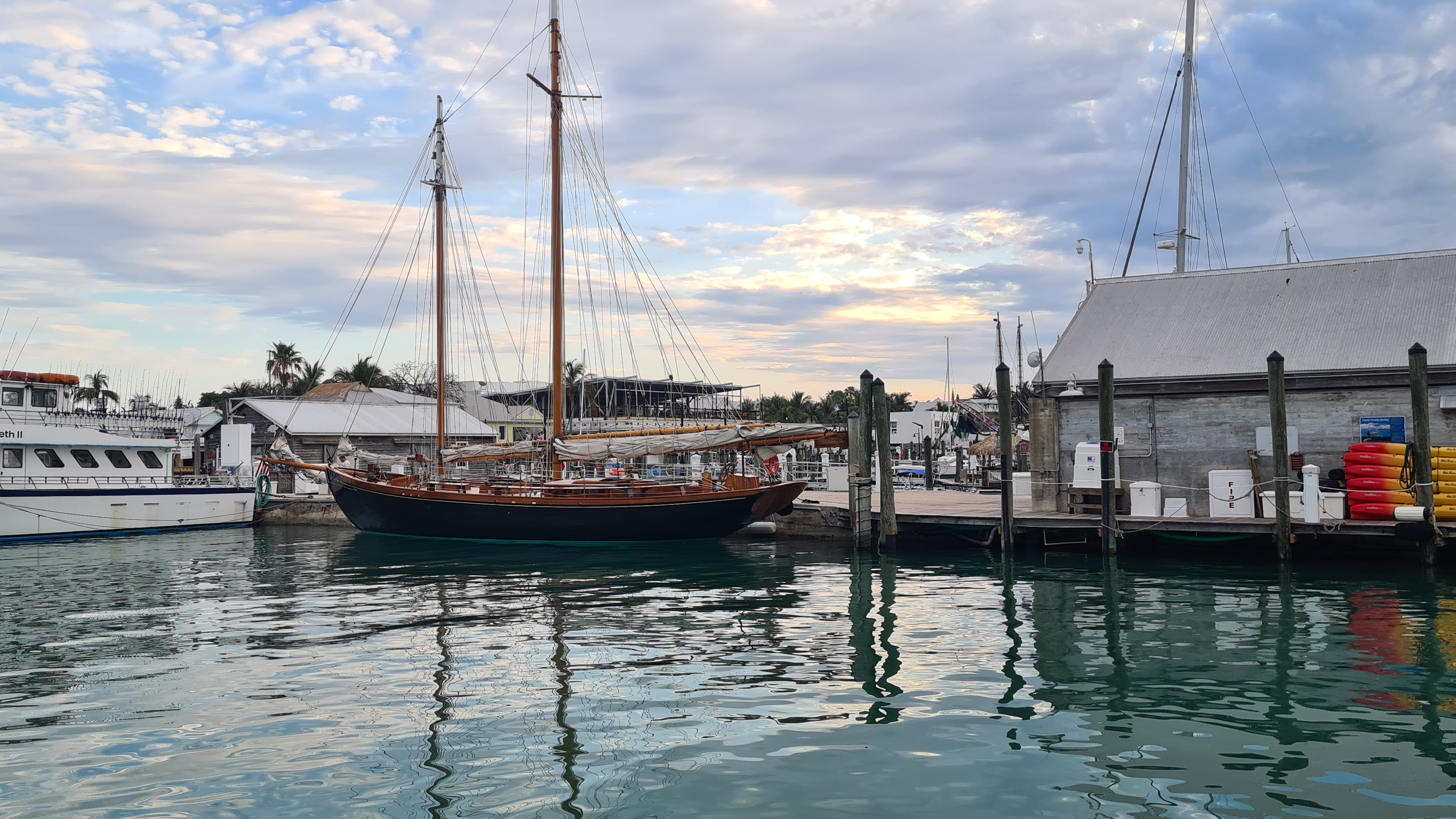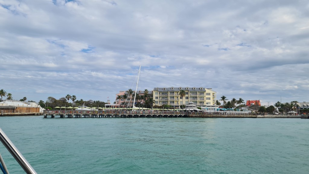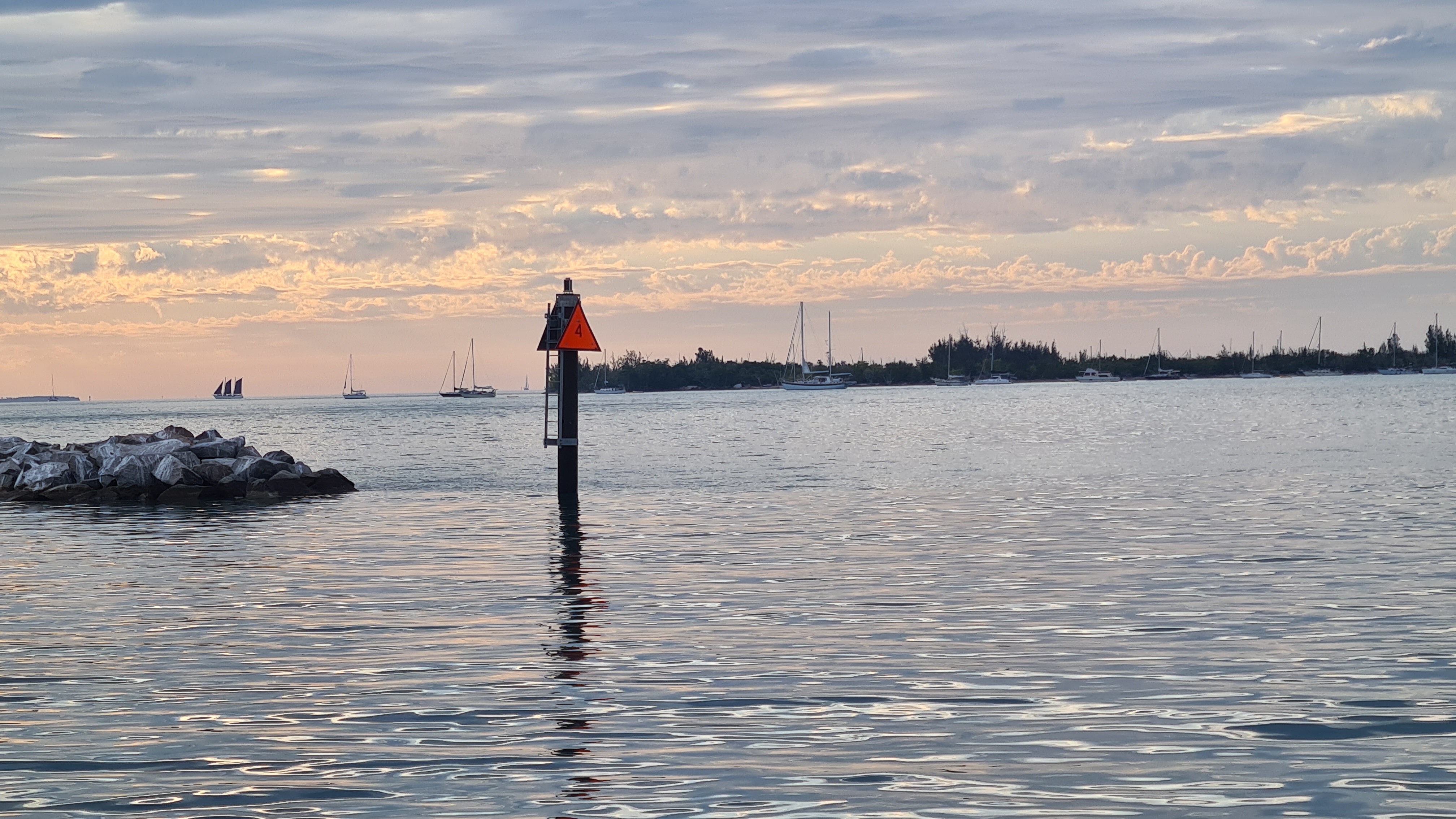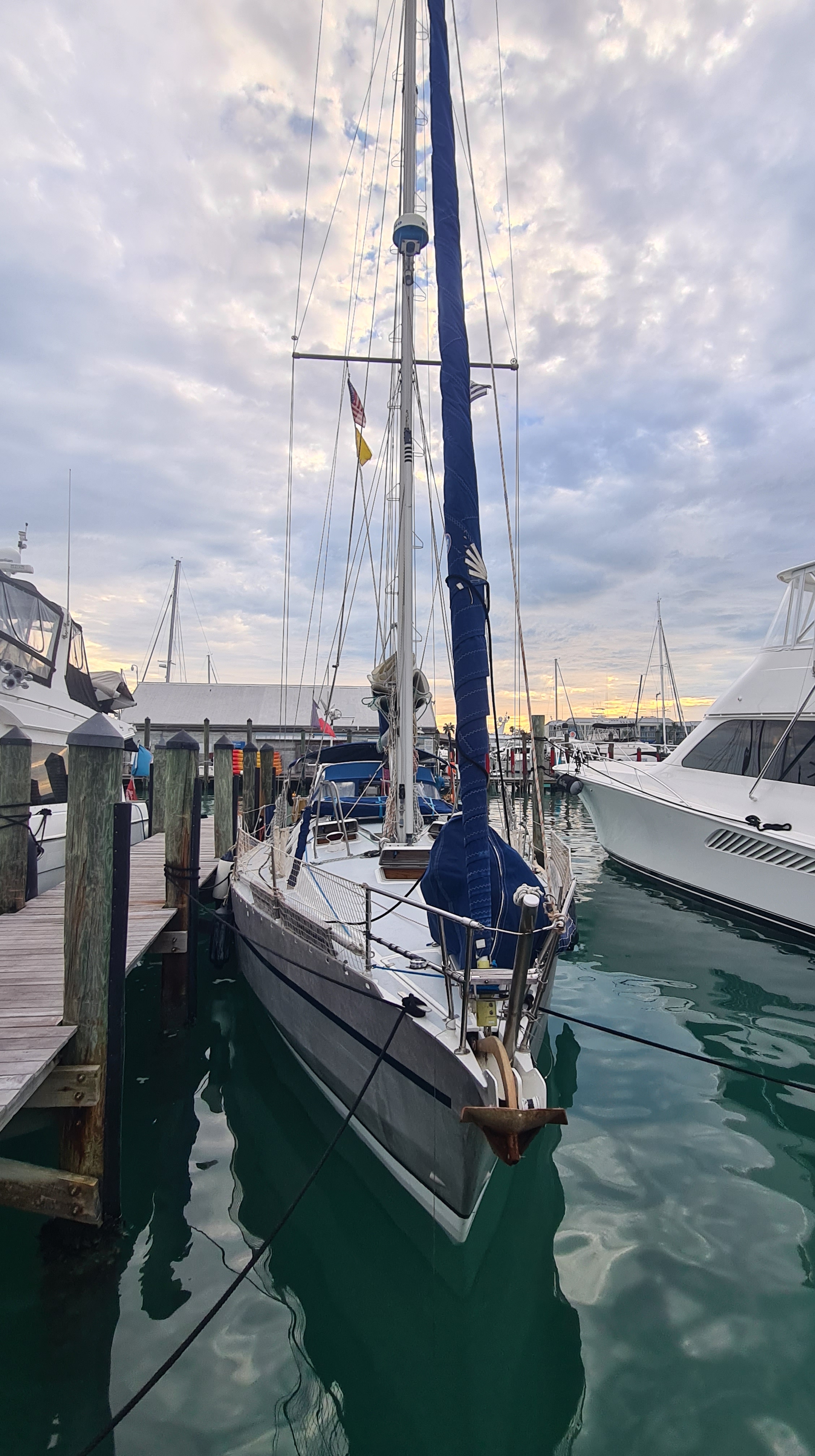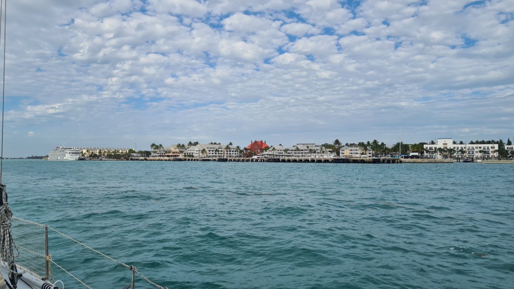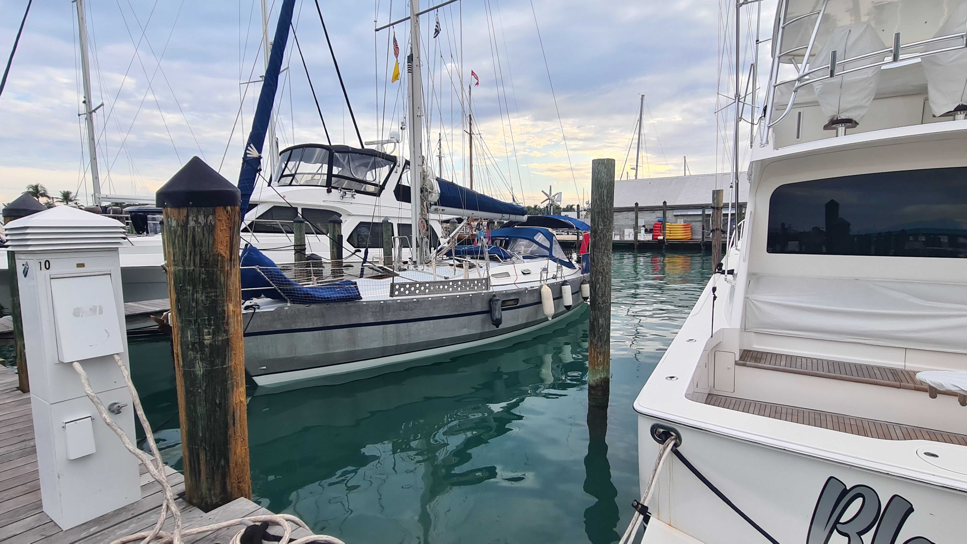Il ne nous reste que 30 milles à parcourir. Nous faisons grâce à Starlink notre déclaration en ligne d’arrivée aux US sur l’application du CBP (Custom and Border Protection) qui nous autorise à entrer et nous enjoint de contacter au plus vite le bureau du CBP du port d’entrée. A 10 milles de Key West, nous voyons arriver un canot des Coast Guards, qui nous demande de mettre en panne, nous affalons donc les voiles et nous laissons dériver. Le canot fait des manœuvres un peu scabreuses dans le clapot, mais ma foi, réussies pour faire monter à bord directement deux agents. Un Français qui fait la traduction (c’est un hasard que ce bi-national ait été à bord et cela nous facilite bien les choses avec leur accent à la noix) et un jeune agent, tous les deux armés jusqu’aux dents. Ils visitent le bateau, pour leur sécurité nous disent-ils ! ?? Puis ils vérifient nos passeports, nos visas, si la procédure d’enregistrement est bien faite. Ils attendent les instructions de leur chef contacté par radio qui doit contrôler de son côté que nous ne sommes pas des trafiquants ou des terroristes, puis après une petite attente ils réembarquent sur leur canot et nous autorisent à repartir. Le skipper du canot n’a pas l’air rigolo du tout, mais les deux gars passés à bord sont très sympathiques, plutôt rassurants et décontractés, si bien, que cela se passe dans une bonne ambiance. Je n’ai pas osé faire de photos de l’intervention, c’est dommage ! Nous arrivons vers 17 heures locales (il est encore 15 heures pour nous à l’heure de l’Amérique centrale) à Key West Bight Marina où nous nous sommes payé le luxe de réserver une place pour quelques jours.